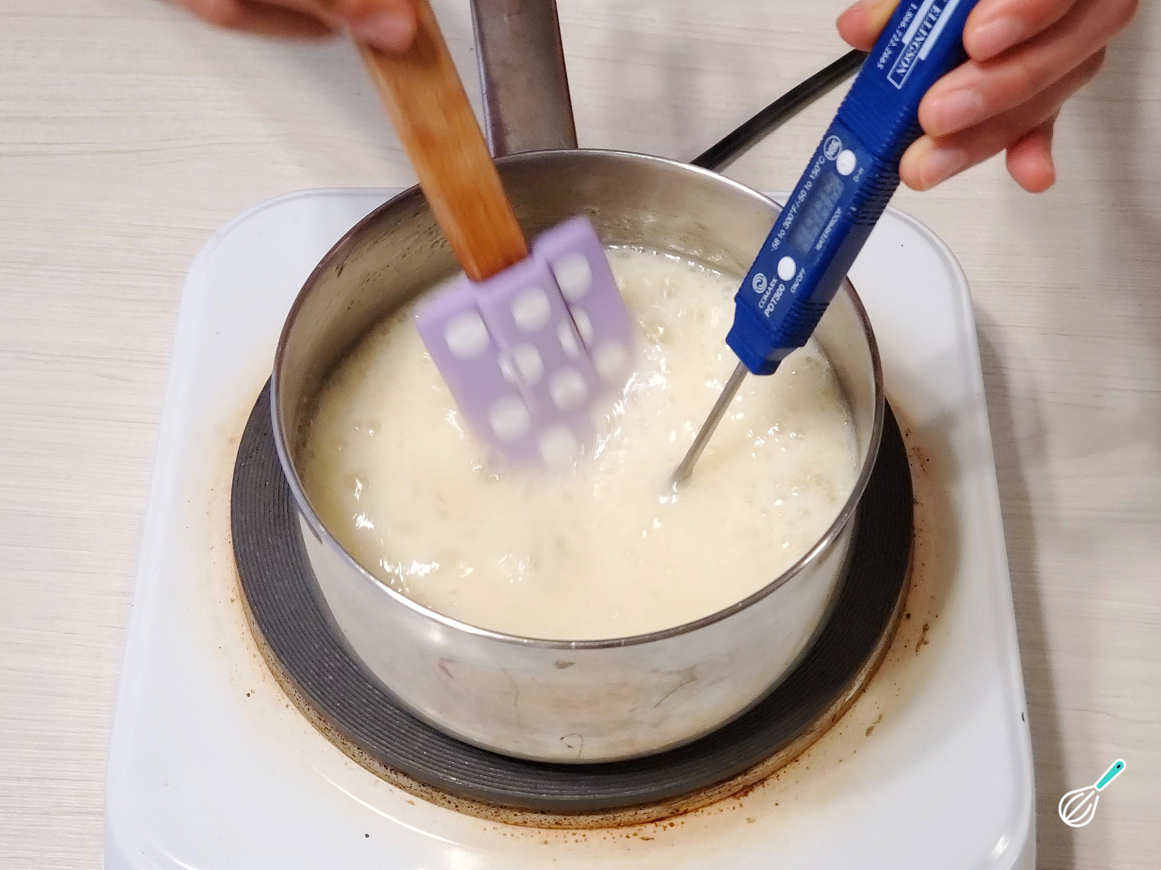 Depois do tempo de descanso, aqueça em banho-maria ou no micro-ondas por um minuto e meio. Mexa bem, meça a temperatura com um termômetro de cozinha e deixe esfriar a 35 ° C para utilizar em uma sobremesa congelada.