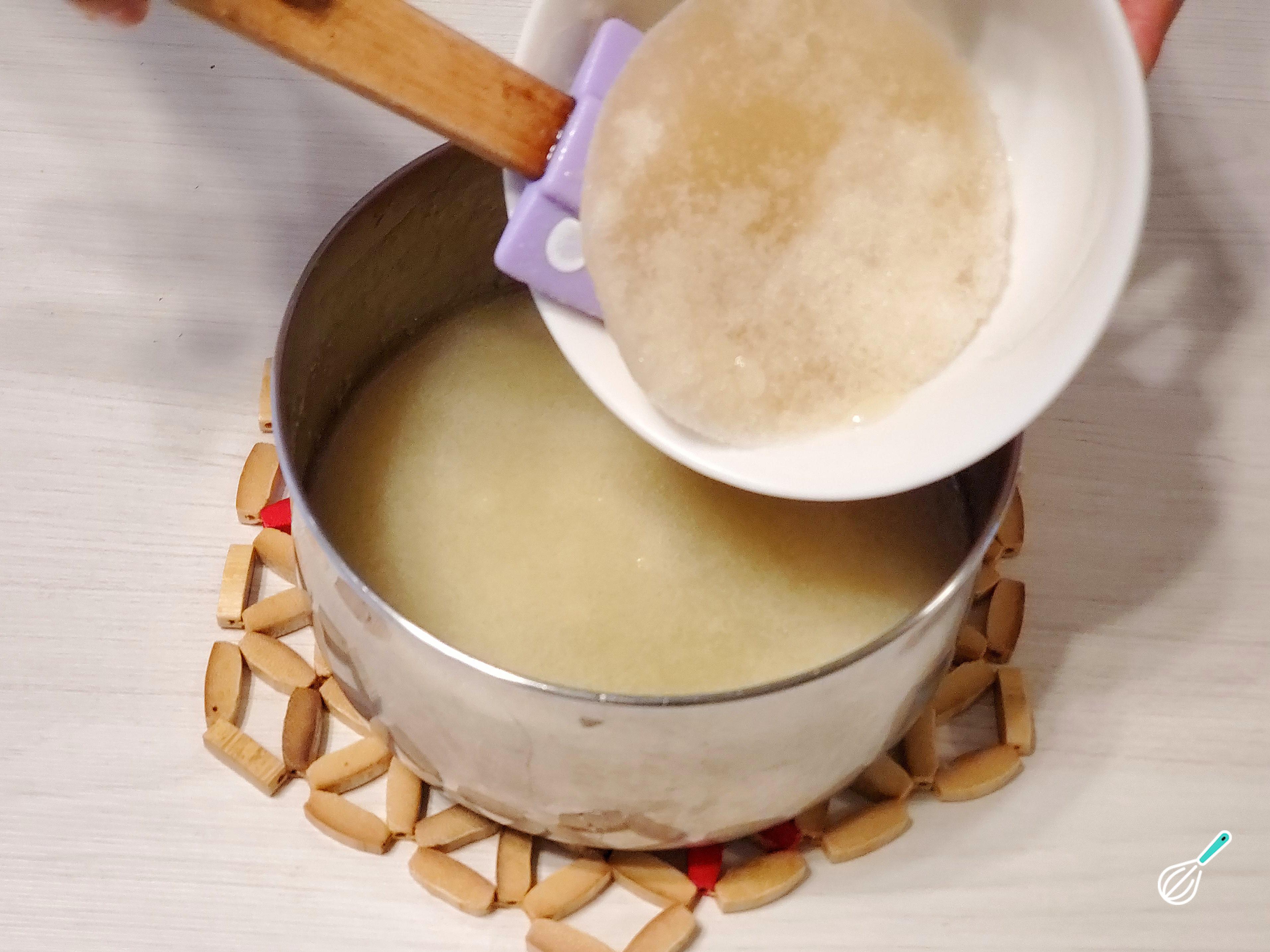 Depois desse minuto, retire imediatamente do fogo e acrescente a gelatina previamente hidratada. Mexa até derreter.