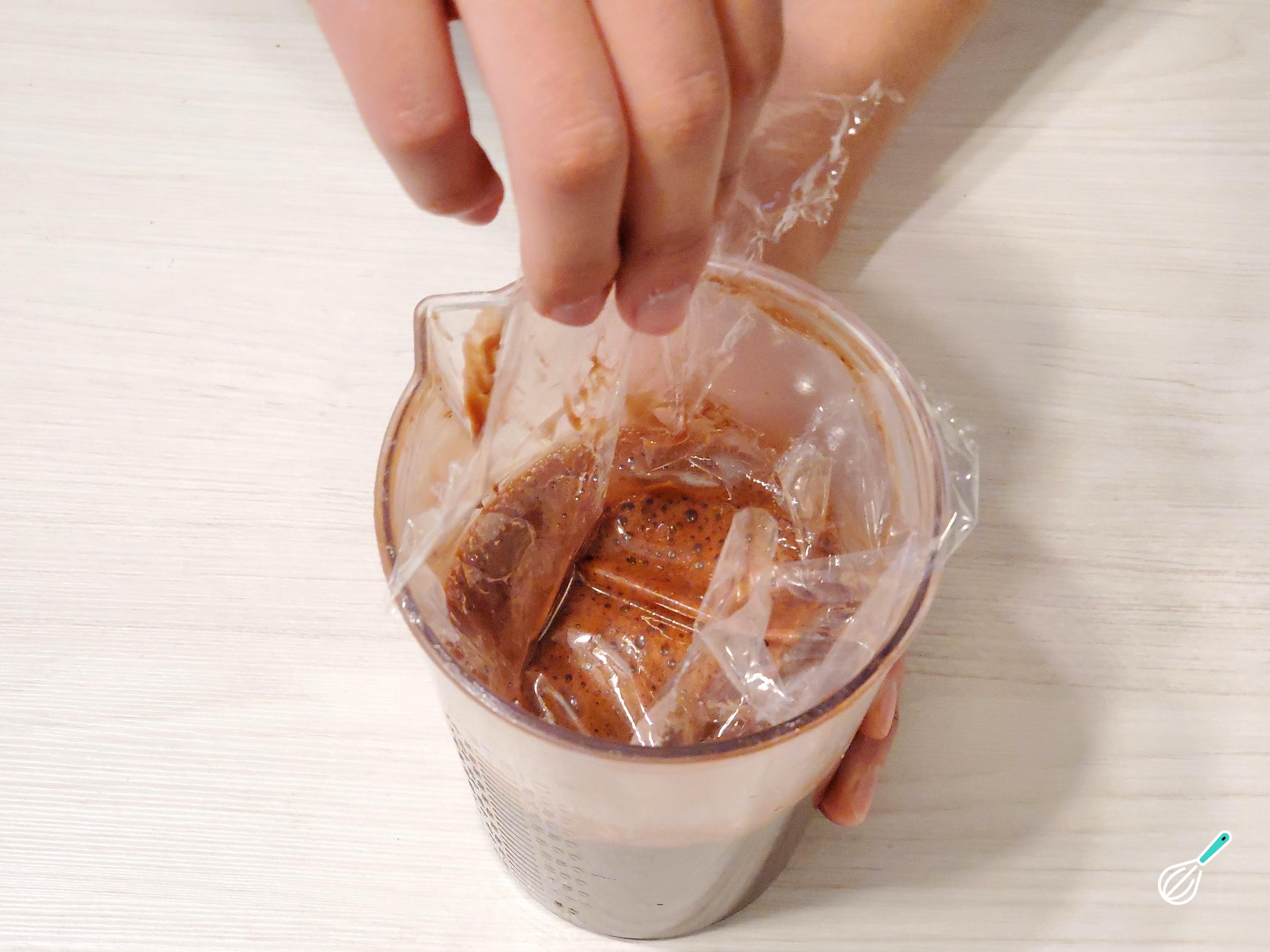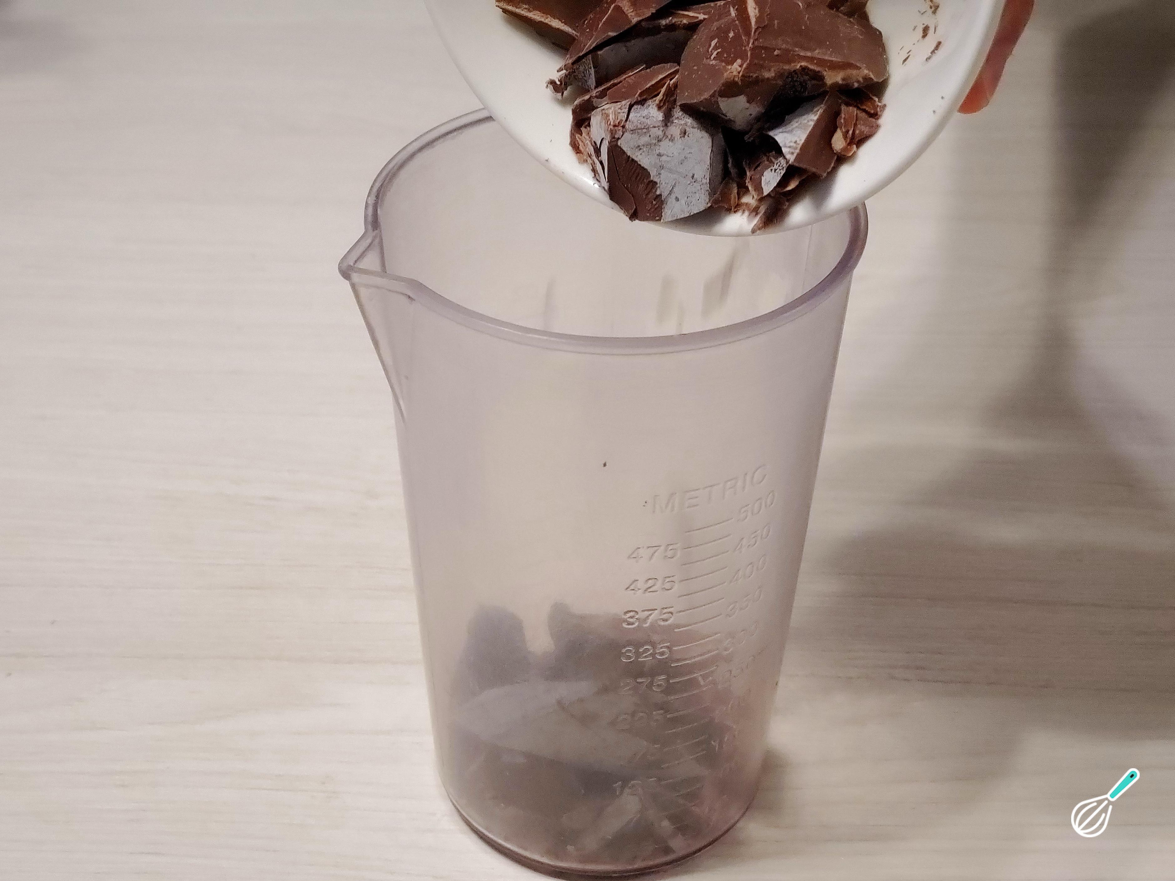 Além disso, coloque rapidamente o chocolate previamente picado no copo do processador, é importante que este copo seja alto e estreito para evitar a introdução de bolhas no glacê.