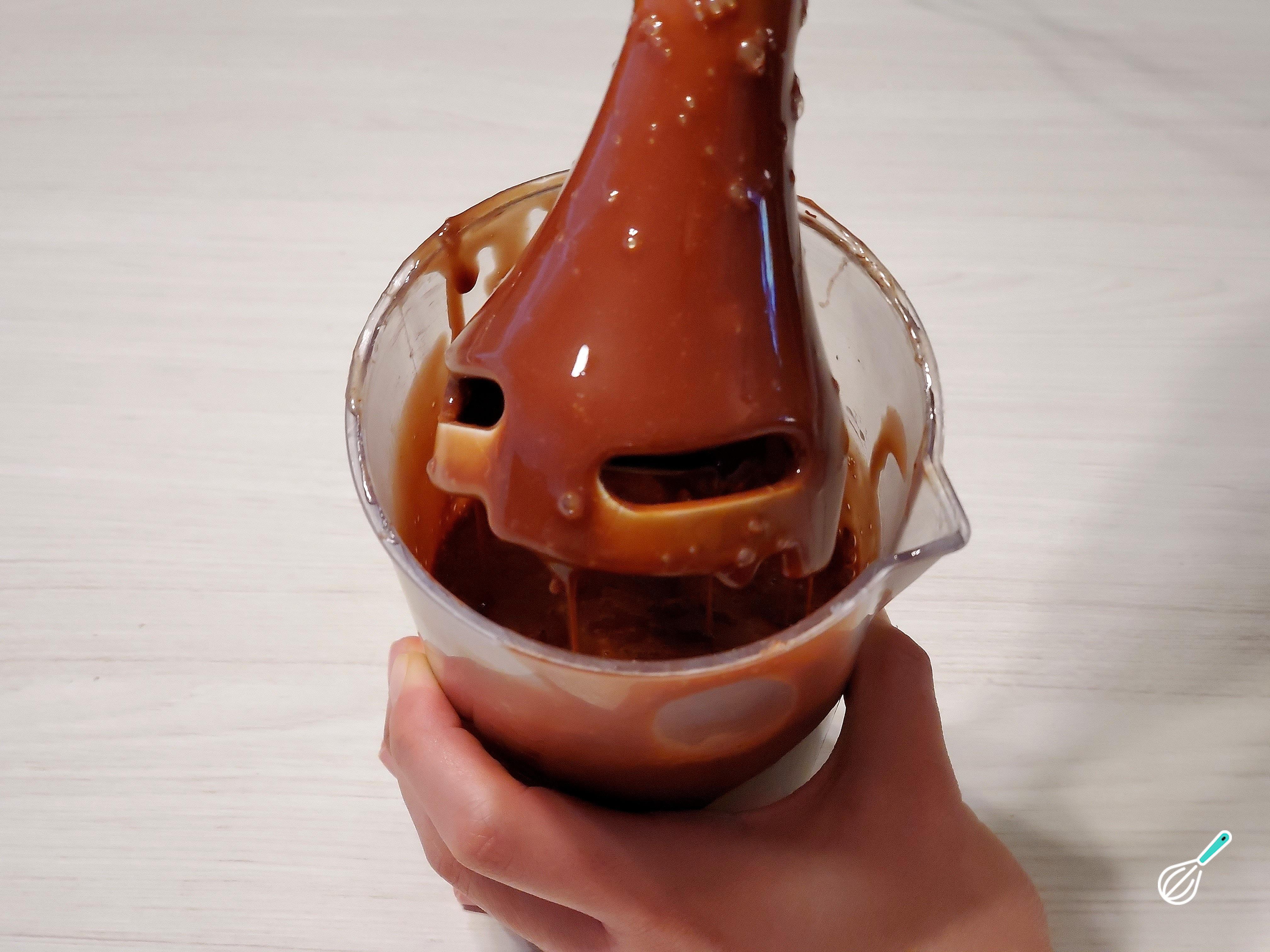 Em seguida, despeje sobre o chocolate amargo ou branco. Deixe descansar por alguns minutos para que o chocolate aqueça e emulsione com o mixer até obter uma mistura homogênea.