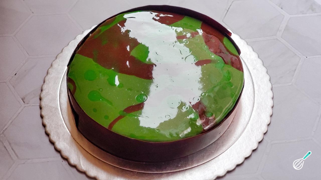 - Aqueça ambos os glacês a 35°C e despeje-os sobre o bolo congelado.