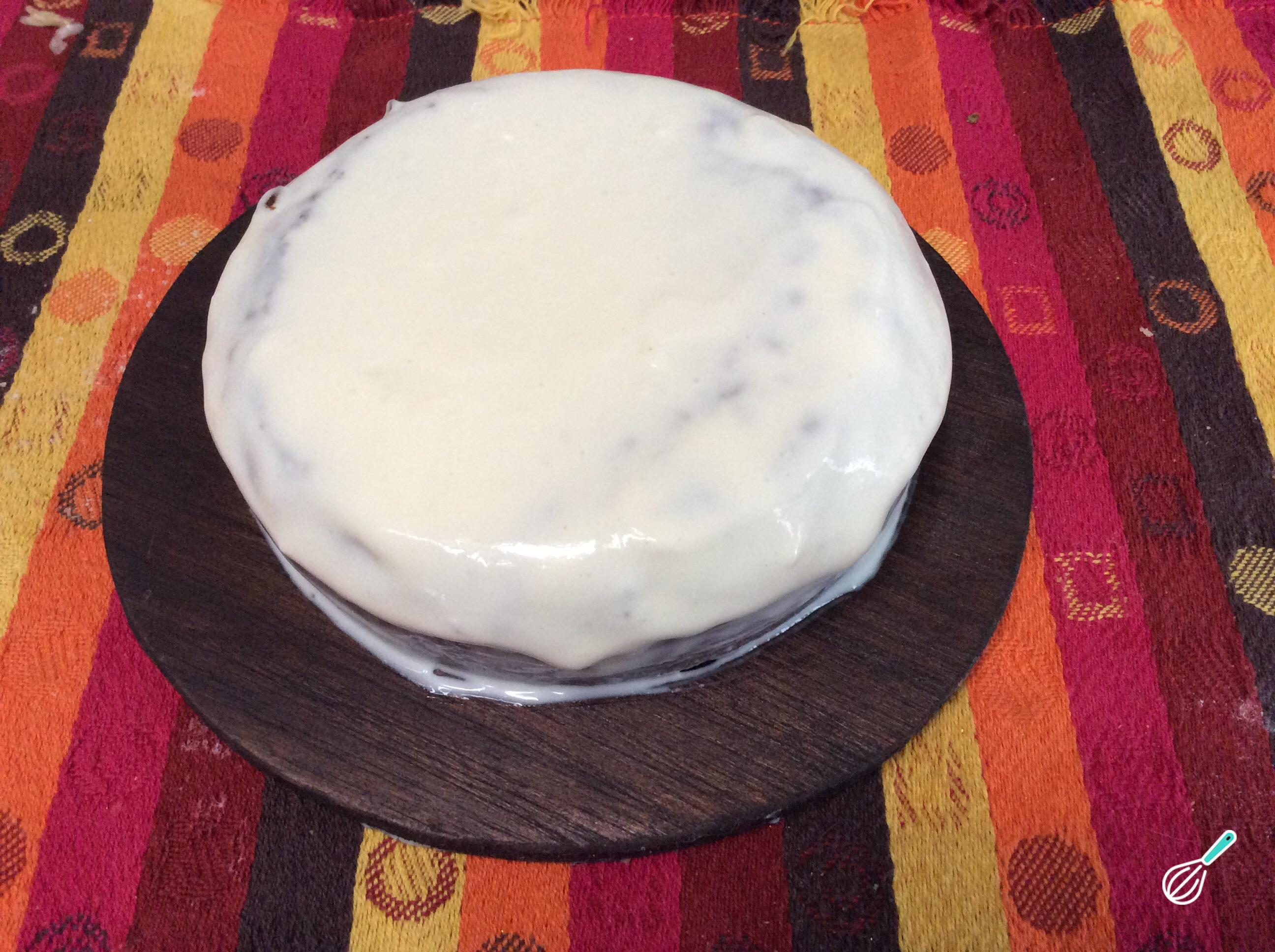 Cubra um bolo ao seu gosto com o glacê. Neste caso o bolo escolhido foi o bolo de chocolate para diabéticos.