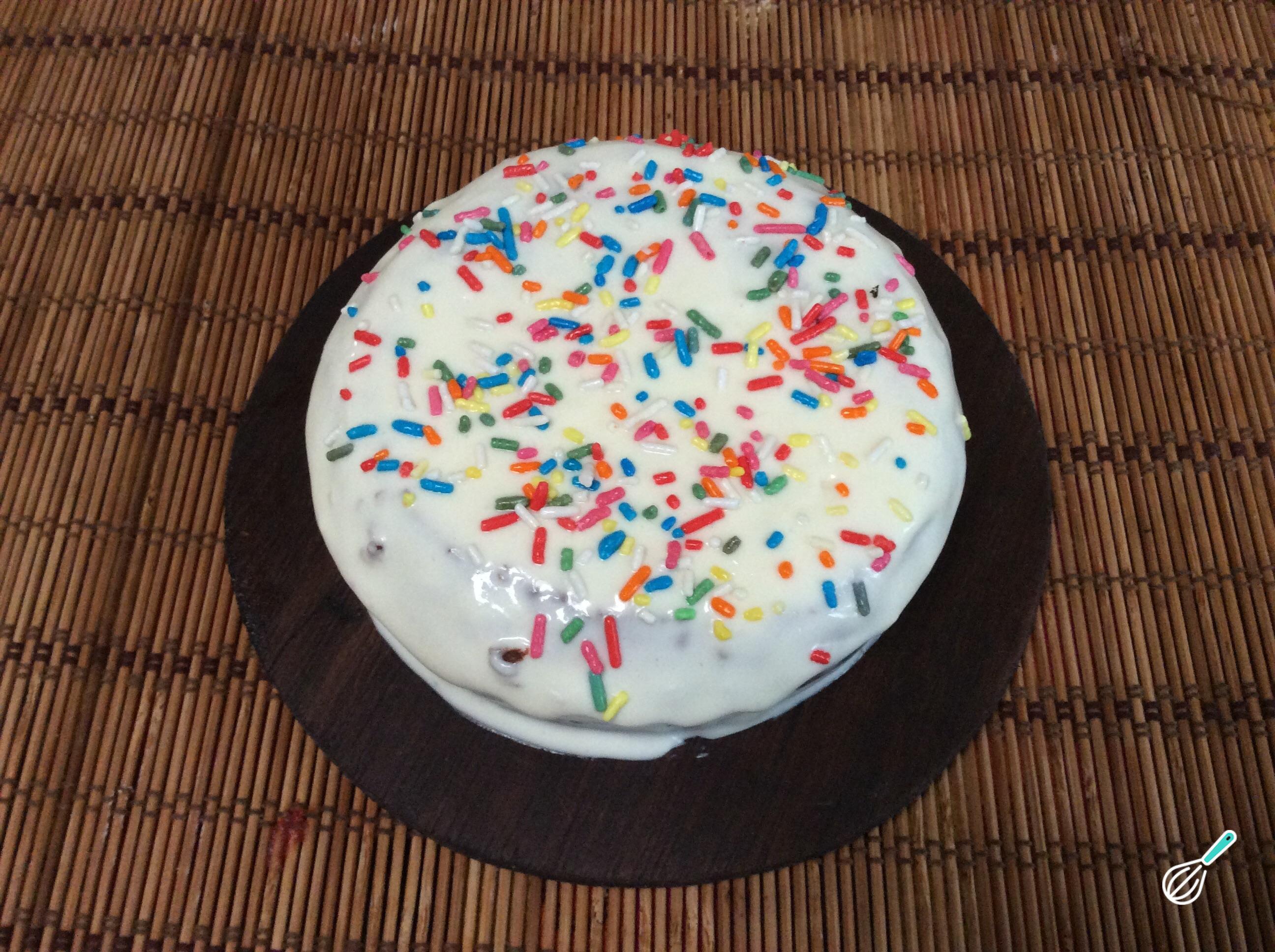 Seu bolo decorado com glacê de baunilha para diabéticos está pronto! Sirva em seguida e delicie-se!
