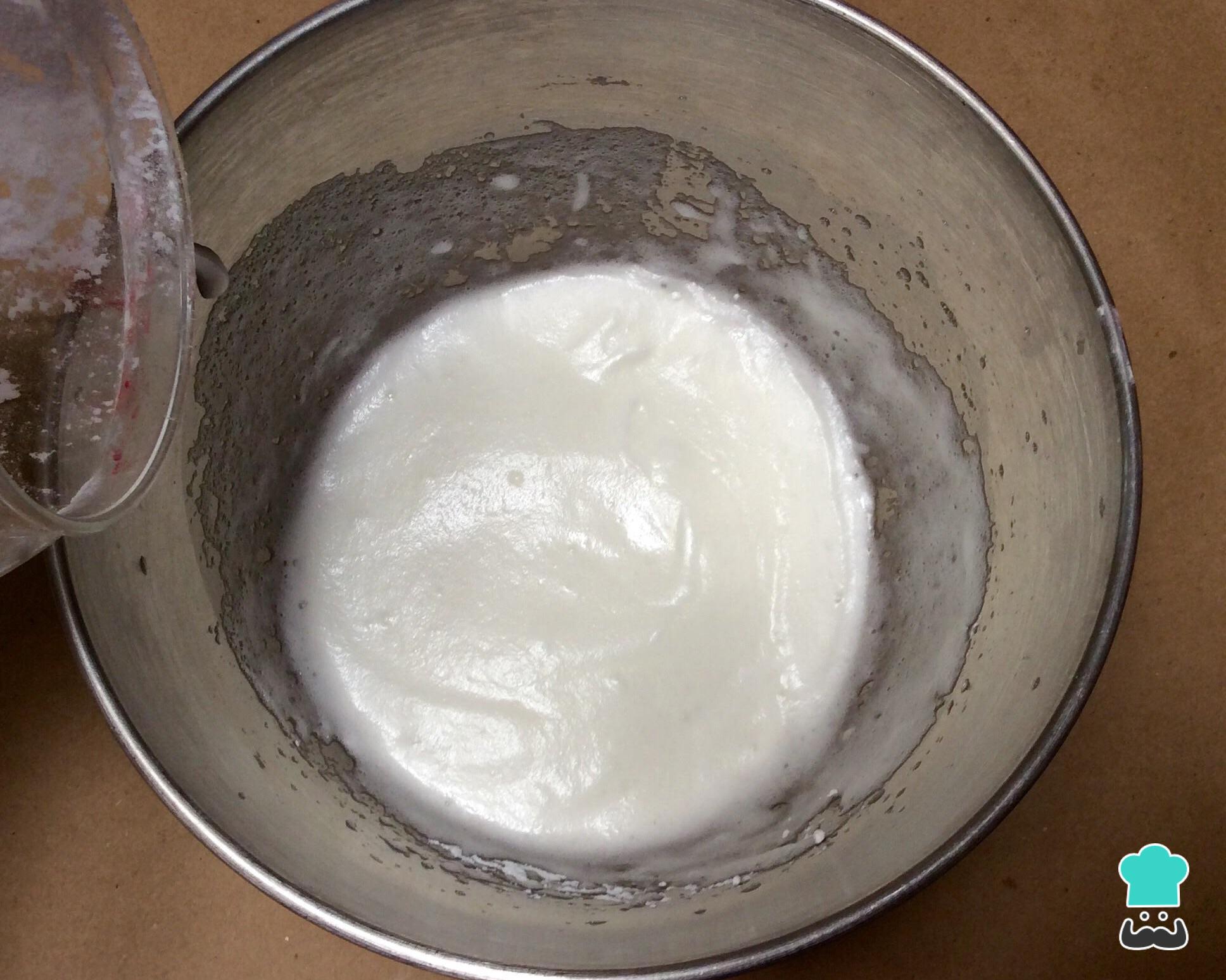 O passo seguinte da receita de glacê real é adicionar o açúcar de confeiteiro pouco a pouco, enquanto bate, até obter um merengue espesso.