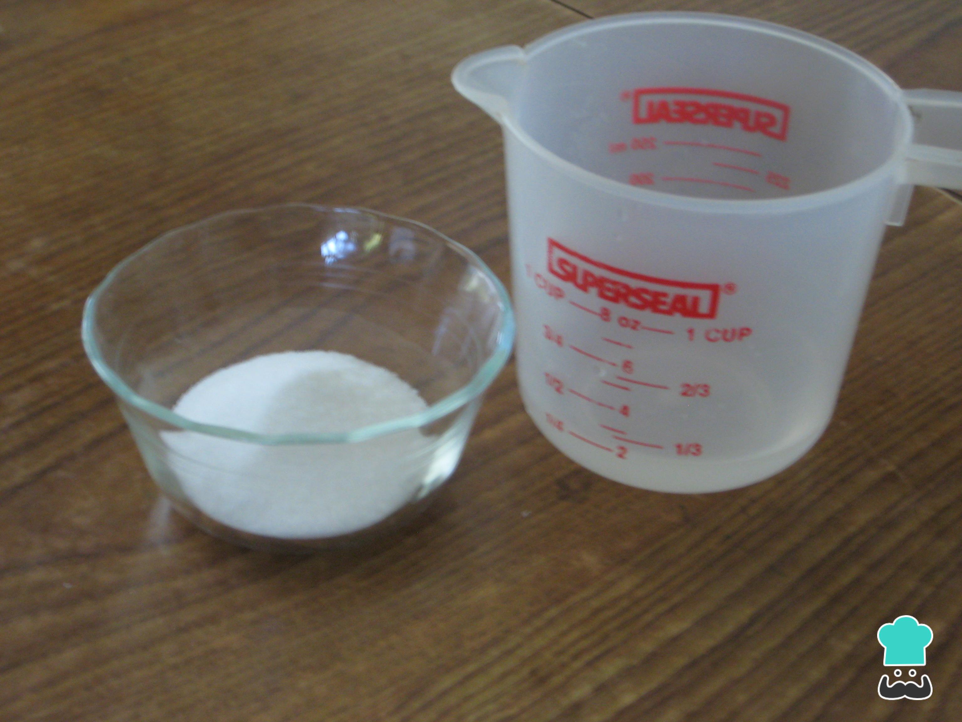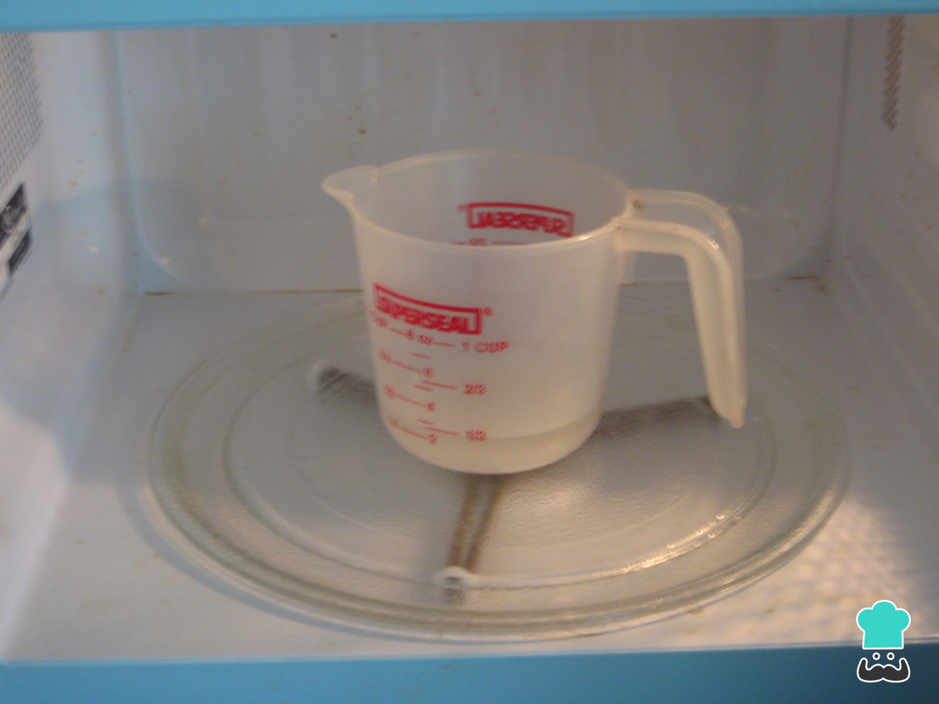 É bem fácil fazer gota de chuva em casa! Comece por colocar a água em um copo, se quiser pode adicionar nela o açúcar, e esquente no microondas por 30 segundos. Misture até o açúcar dissolver.