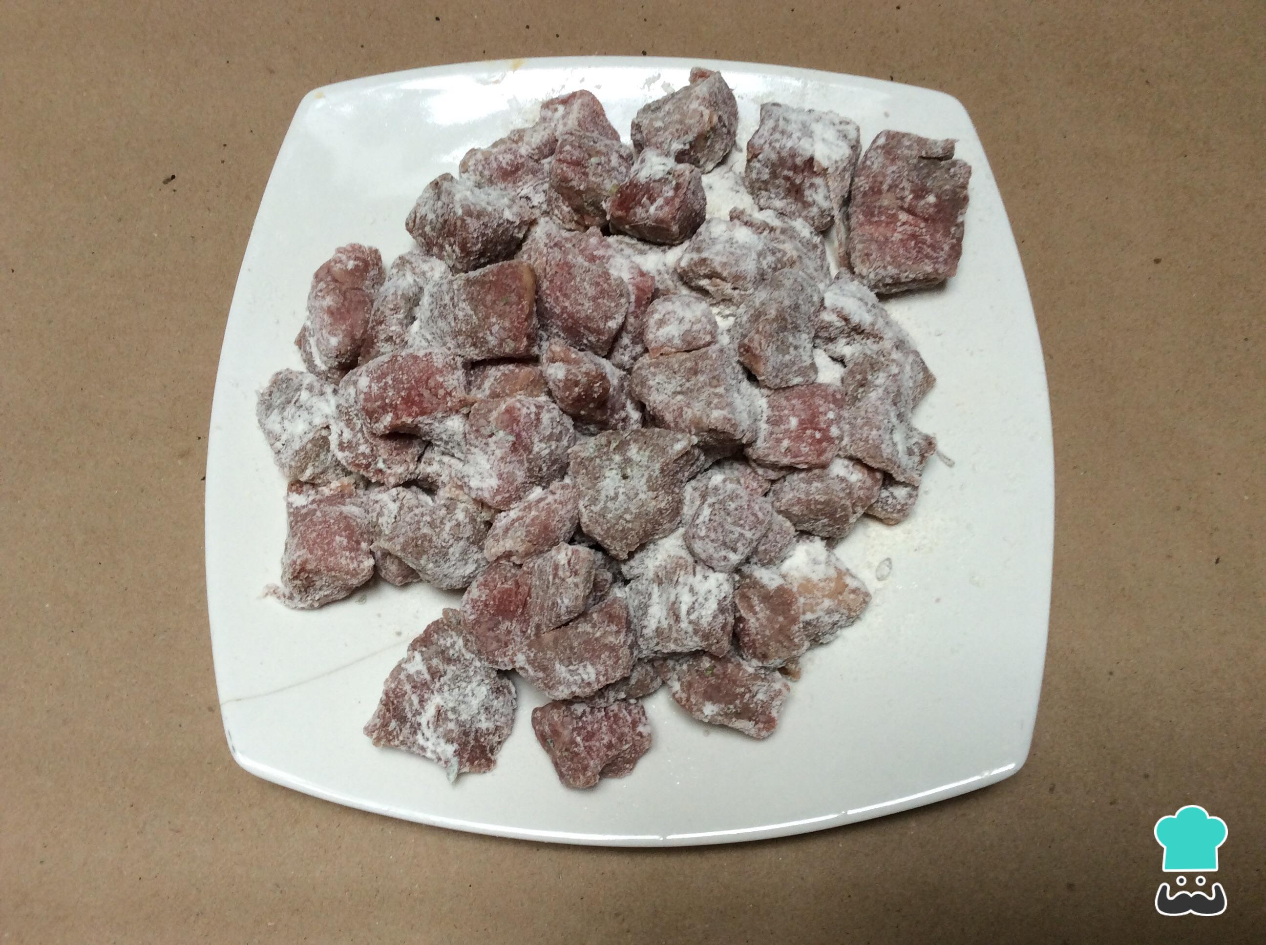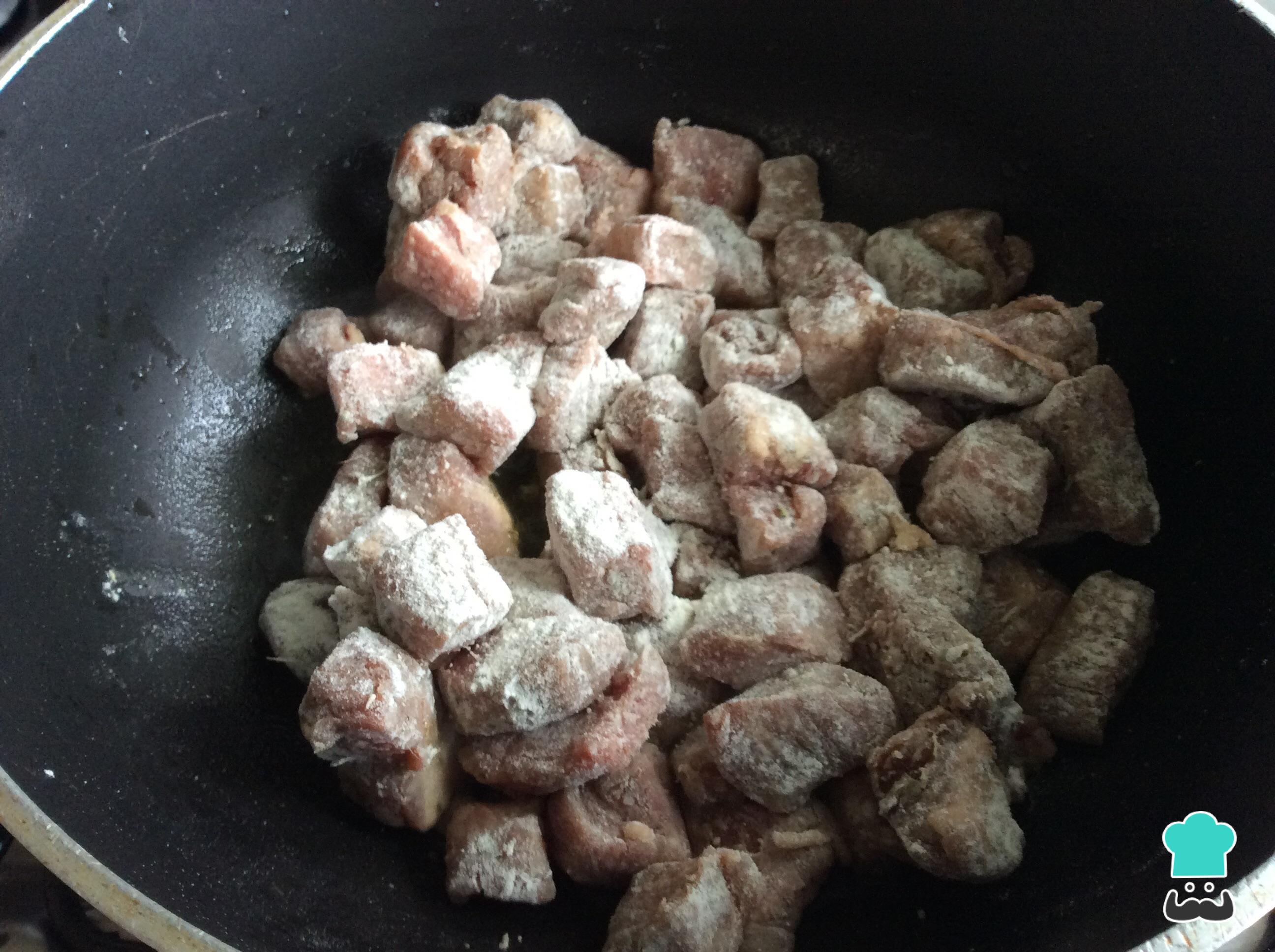 Tempere a carne com sal e pimenta e cubra com farinha, para que o goulash fique mais espesso.