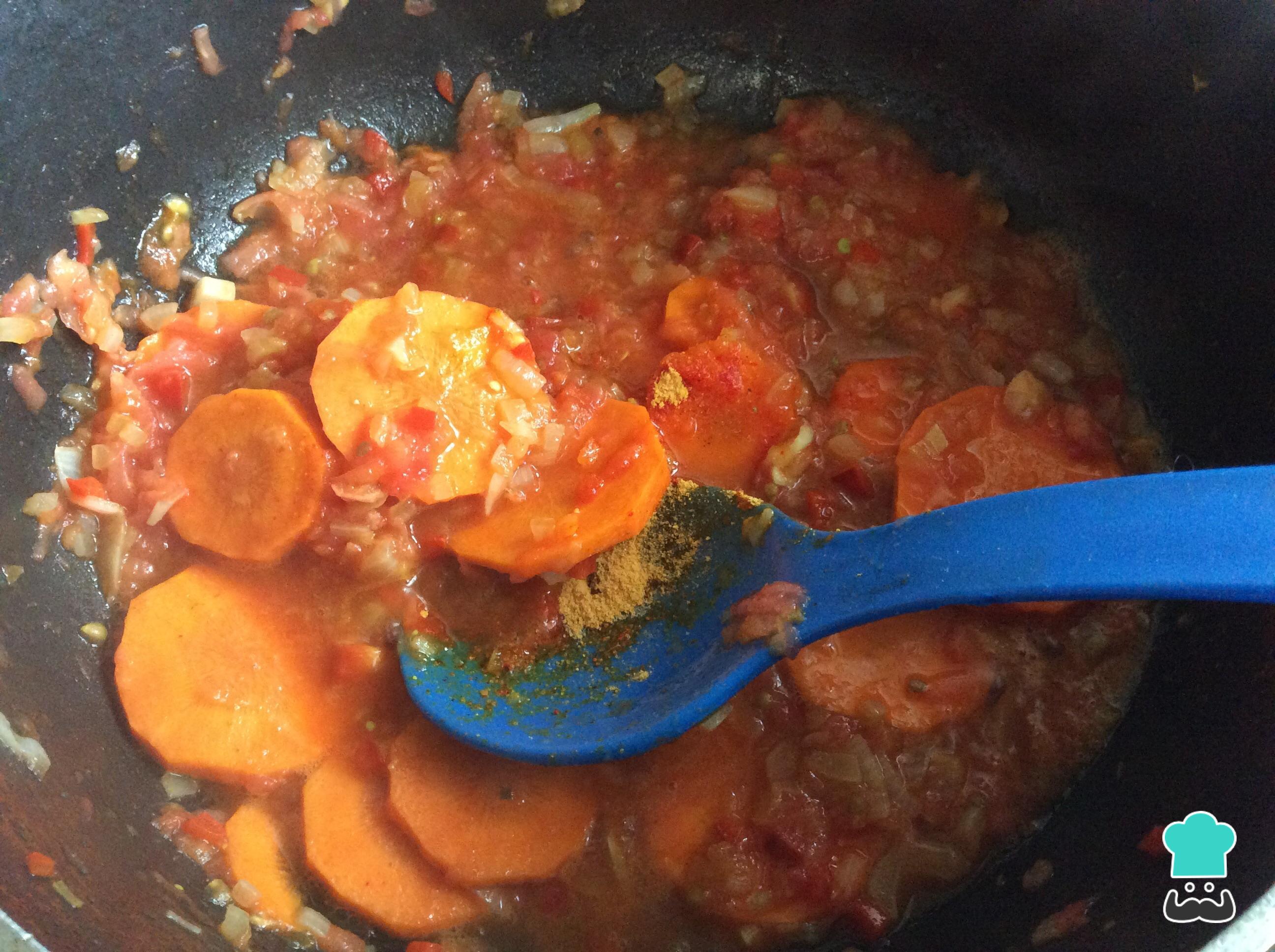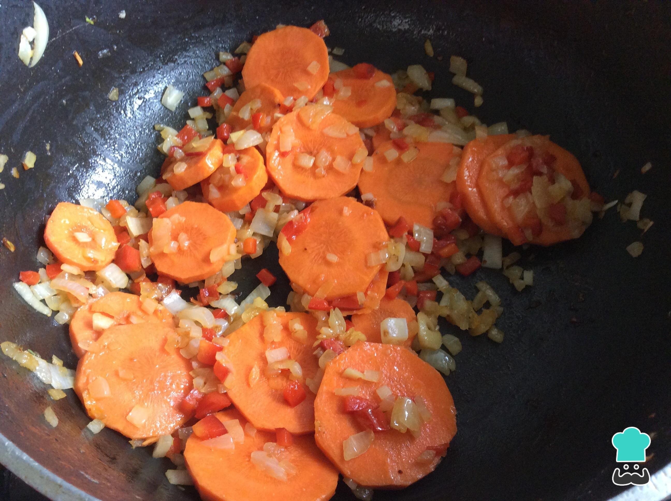 Na mesma frigideiracozinhe a cenoura cortada em rodelas, o pimentão vermelho e a cebola, ambos picados finamente, em fogo alto por 5 minutos.