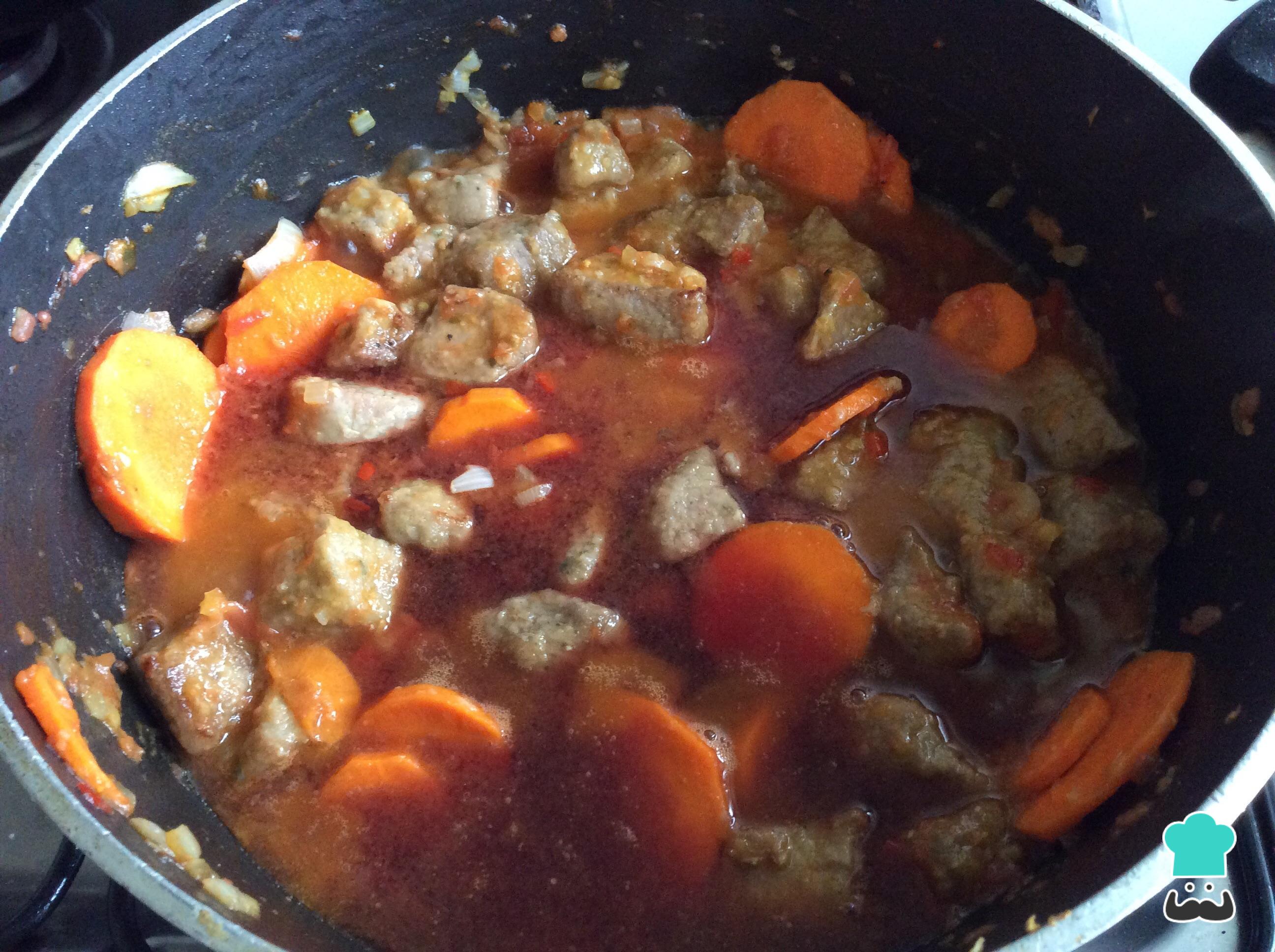 O passo seguinte do goulash húngaro é, em uma frigideira funda em fogo alto com um pouco de azeite, cozinhar a carne até ficar ligeiramente dourada. Reserve em um prato.
