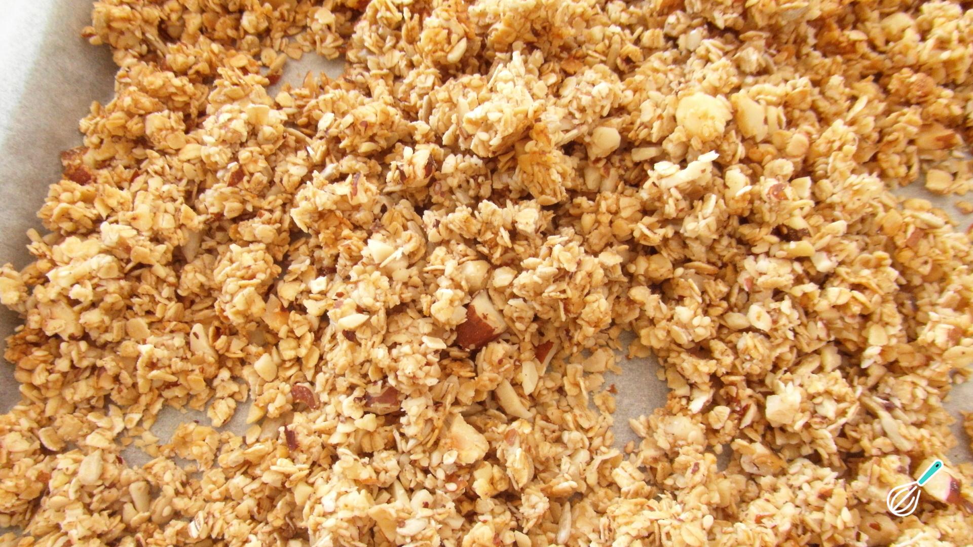Após o tempo indicado, sua granola saudável está pronta! Deixe esfriar, desgrude com uma colher e consuma como substituto de outros cereais, por exemplo, com leite e iogurtes. Bom apetite!