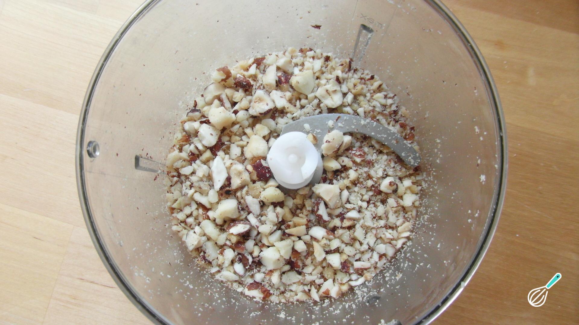 Se, tal como eu, não estiver usando frutos secos moídos, pode batê-los um pouco no liquidificador ou processador, de forma a ficarem em pedaços.