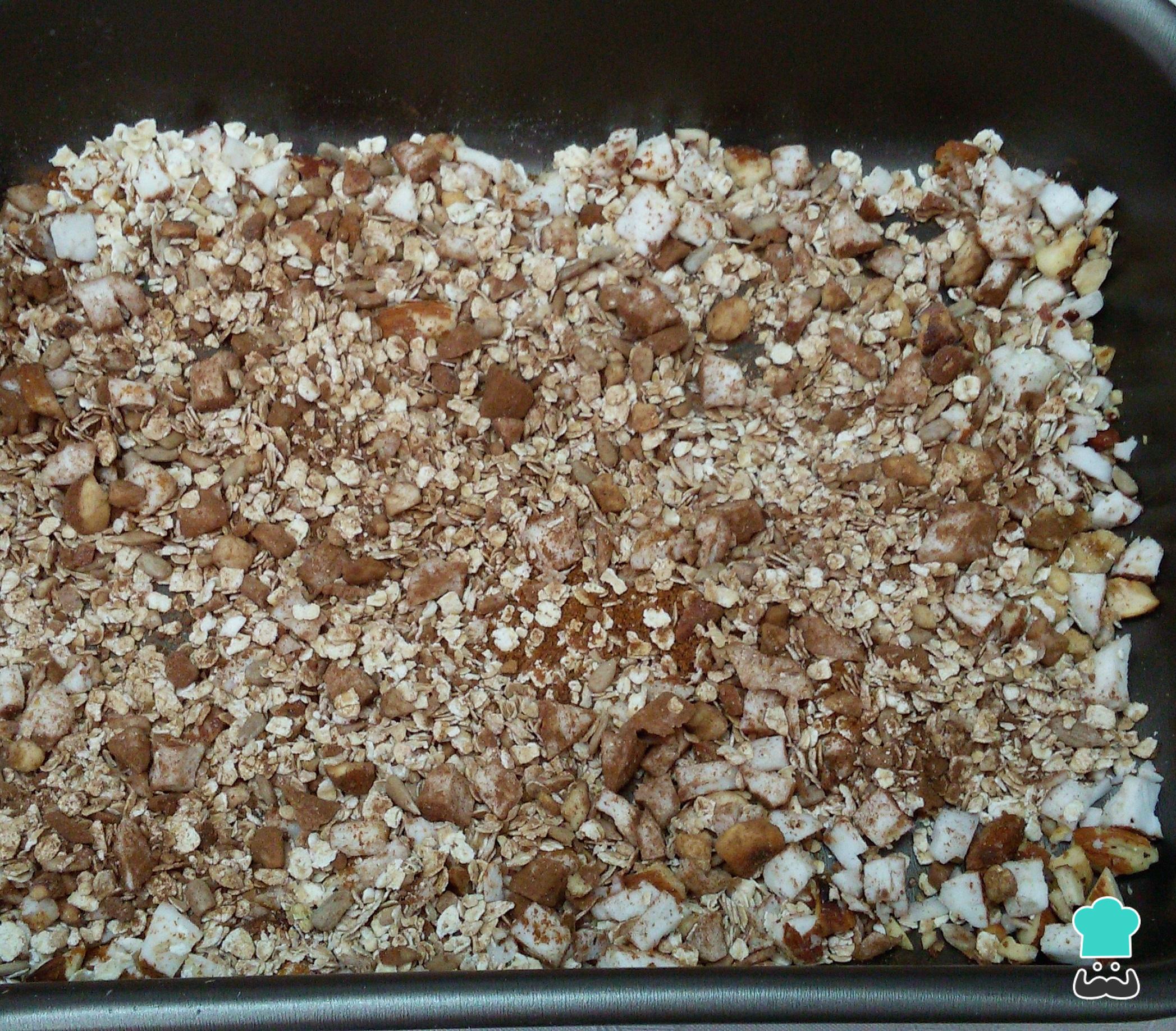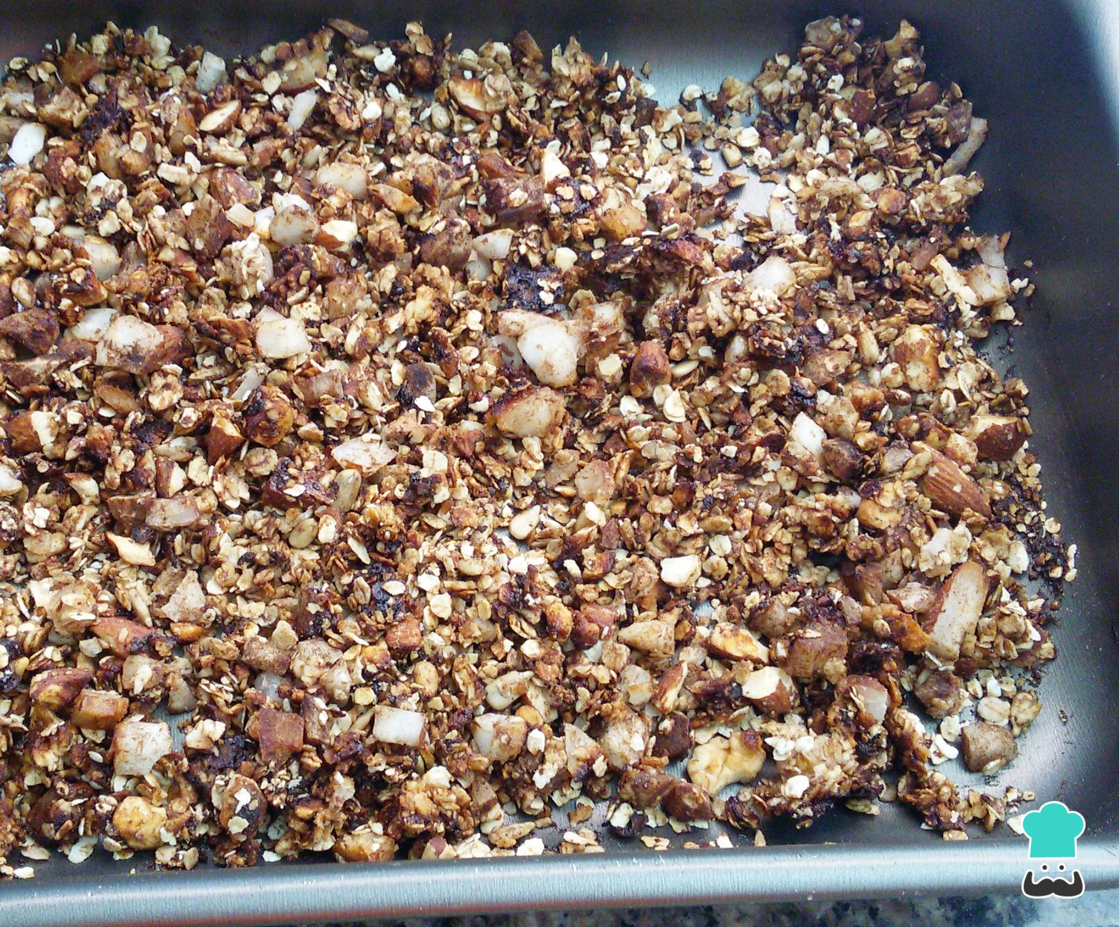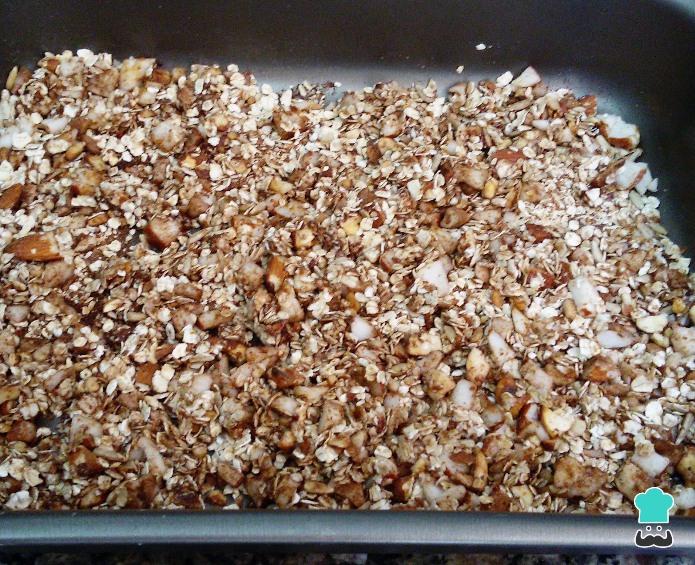 Retire do forno e, com uma colher, misture bem para caramelizar todos os grãos. Deixe esfriar completamente, porque é depois de fria que você consegue uma granola crocante.