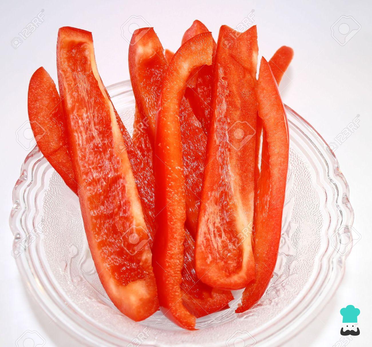 Comece esta receita de grão de bico com feijão, cortando o pimentão vermelho em tiras finas.