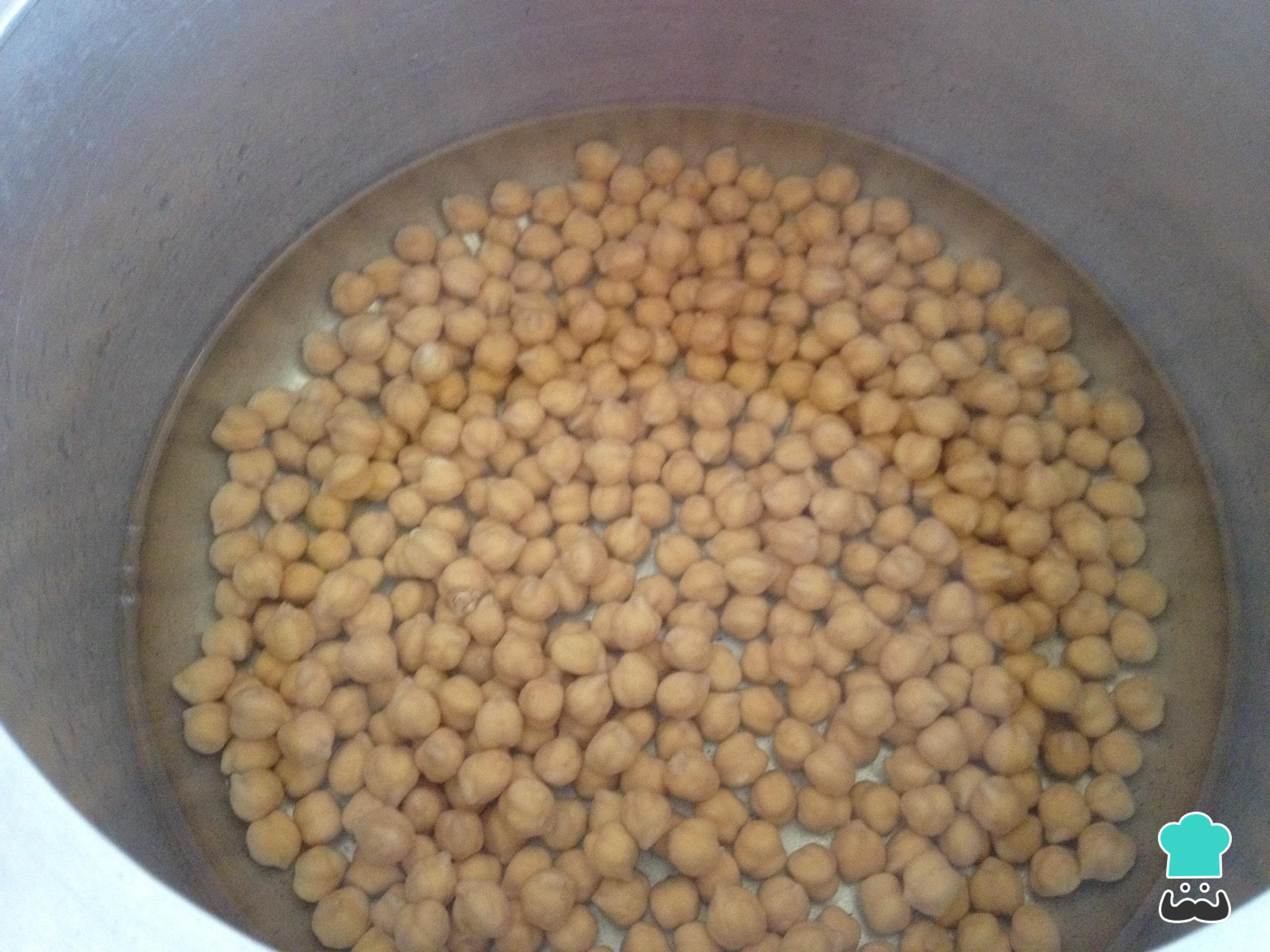 Se estiver usando grão de bico seco, coloque-o de molho em água de uma noite para a outra. Depois cozinhe em uma panela de pressão, com 1 litro de água e um pouco de sal, durante 40 minutos.