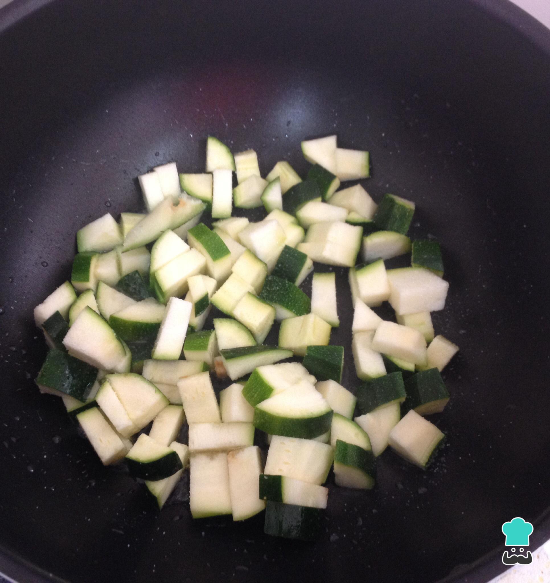 Corte a abobrinha em cubos pequenos e salteie com uma pitada de sal. Quando estiver dourada, retire do fogo e reserve.