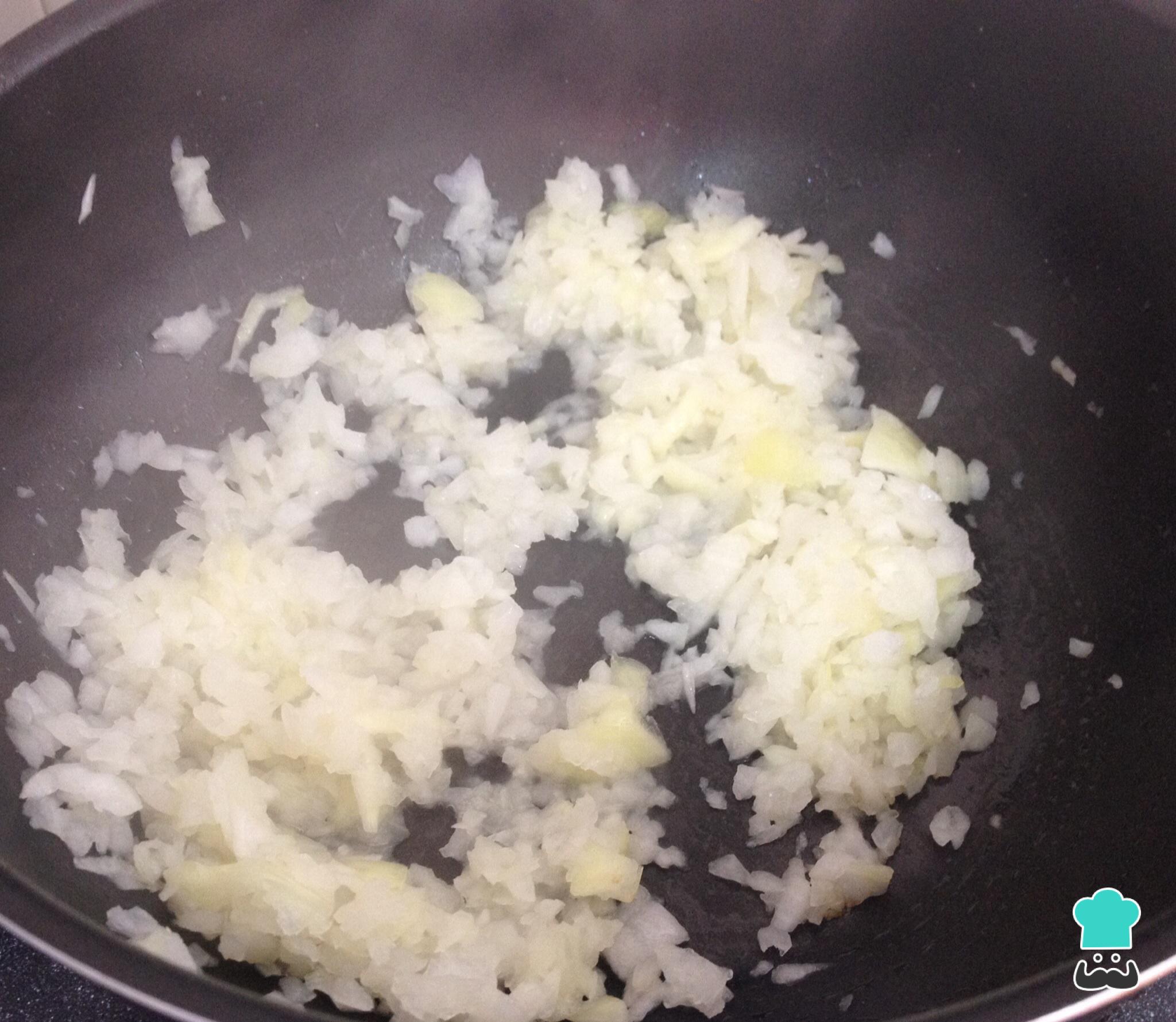 Corte finamente a cebola e o alho, coloque-os na frigideira e tempere com sal e pimenta. Cozinhe em fogo baixo durante 5 minutos até que a cebola esteja macia.