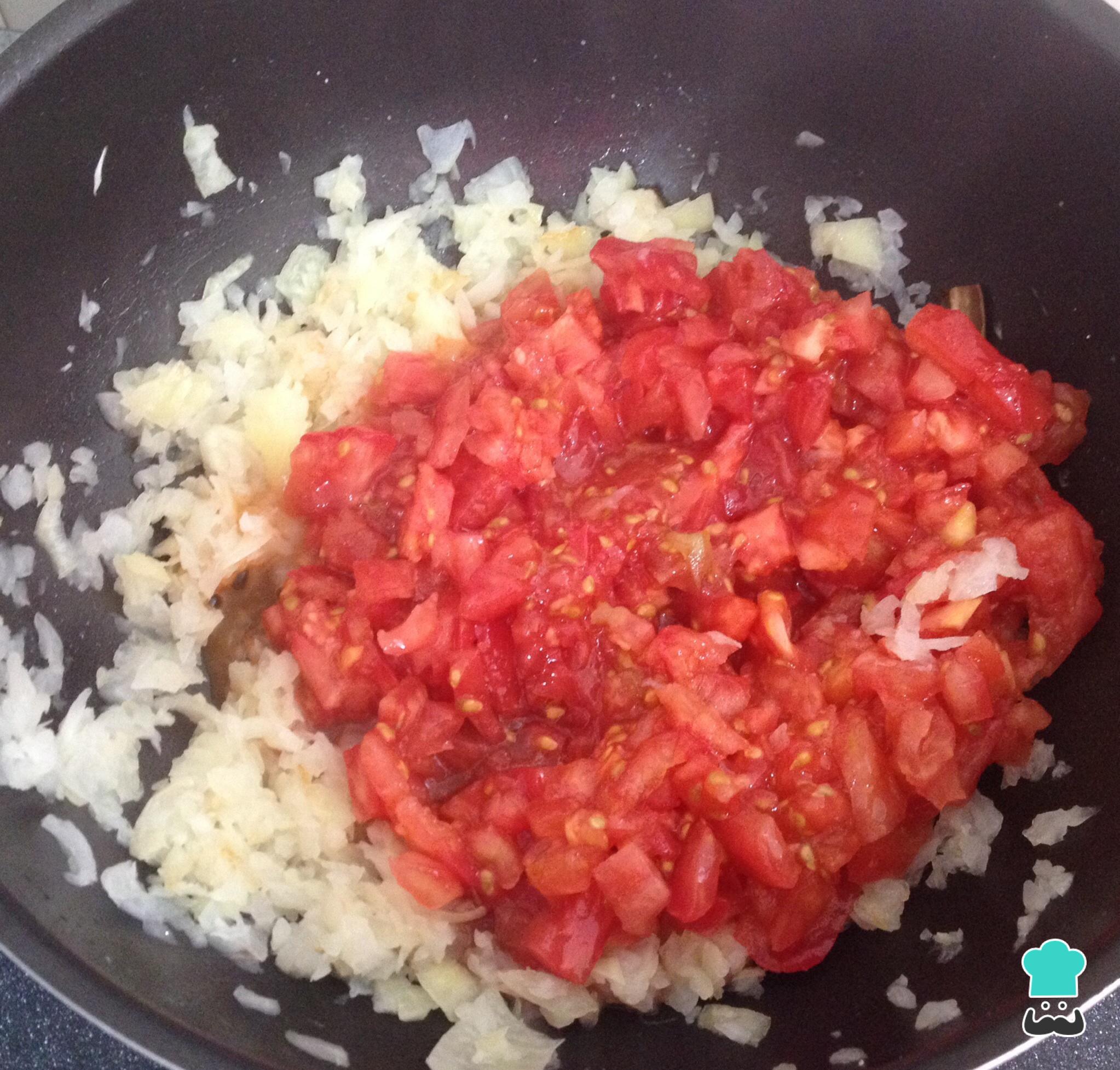 Adicione os tomates descascados e cortados em pequenos cubos, tampe e cozinhe em fogo baixo até que libertem seus sucos.