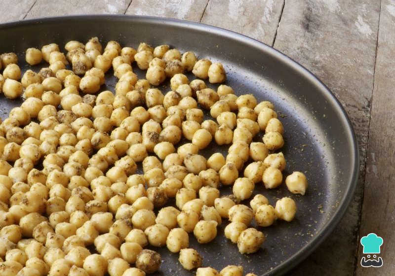 É bem simples preparar esta receita de petisco de grão-de-bico! Depois de demolhar essa leguminosa durante a noite, ou de um dia para o outro, escorra e coloque em uma assadeira grande o suficiente para que os grãos não fiquem sobrepostos.