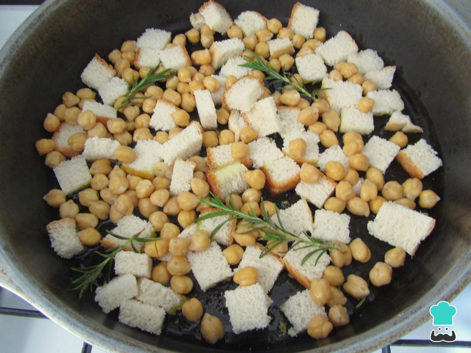 Enquanto isso corte as fatias de pão em cubos e coloque numa panela com óleo junto com o grão-de-bico e o alecrim. Cozinhe em fogo médio, mexendo de vez em quando, até que estes ingredientes fiquem dourados.