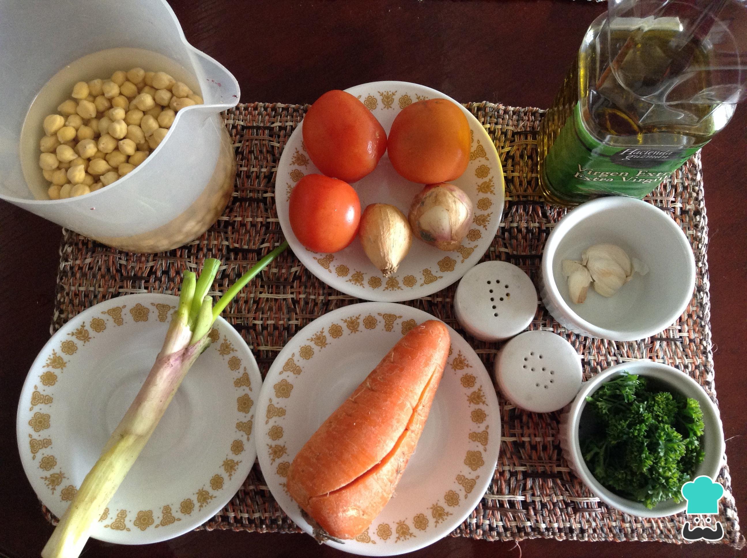 Para começar a fazer nossa receita de grão-de-bico guisado, o primeiro passo é organizar todos os ingredientes.