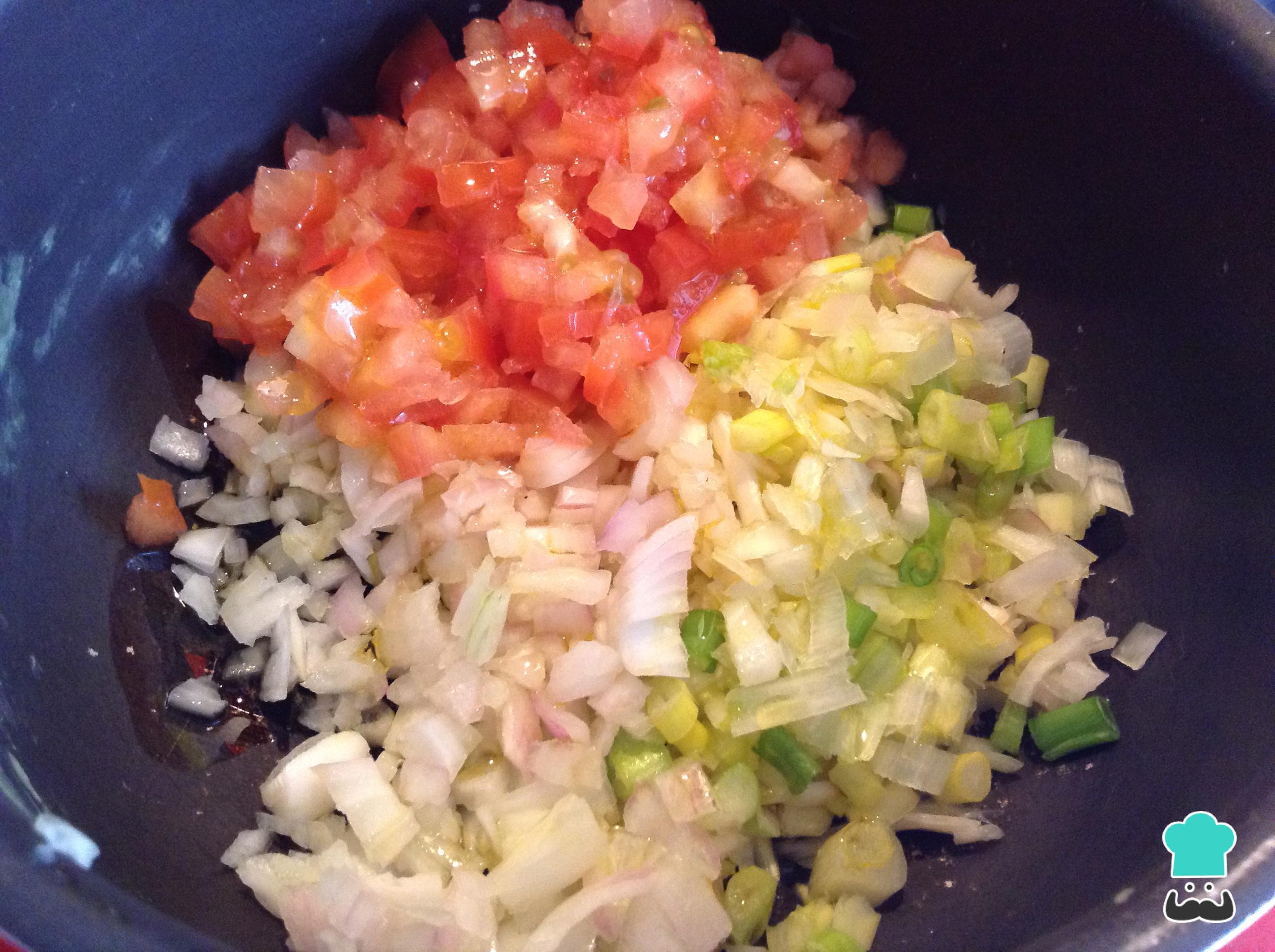 Lave os tomates, as cebolas e a cebolinha verde e pique muito bem. Leve uma panela ao fogo médio com um pouco de azeite e refogue aí estes ingredientes por 5 minutos.