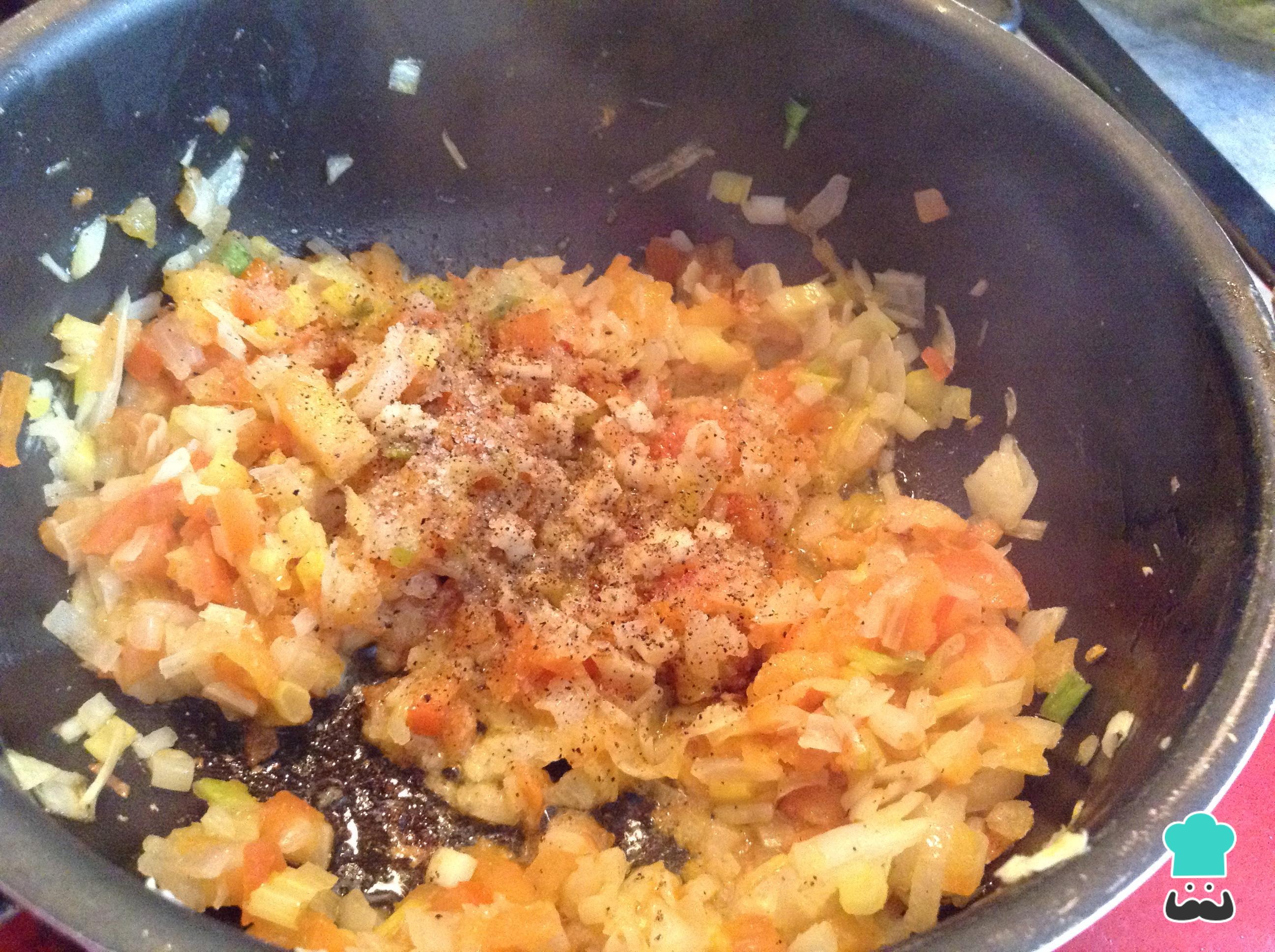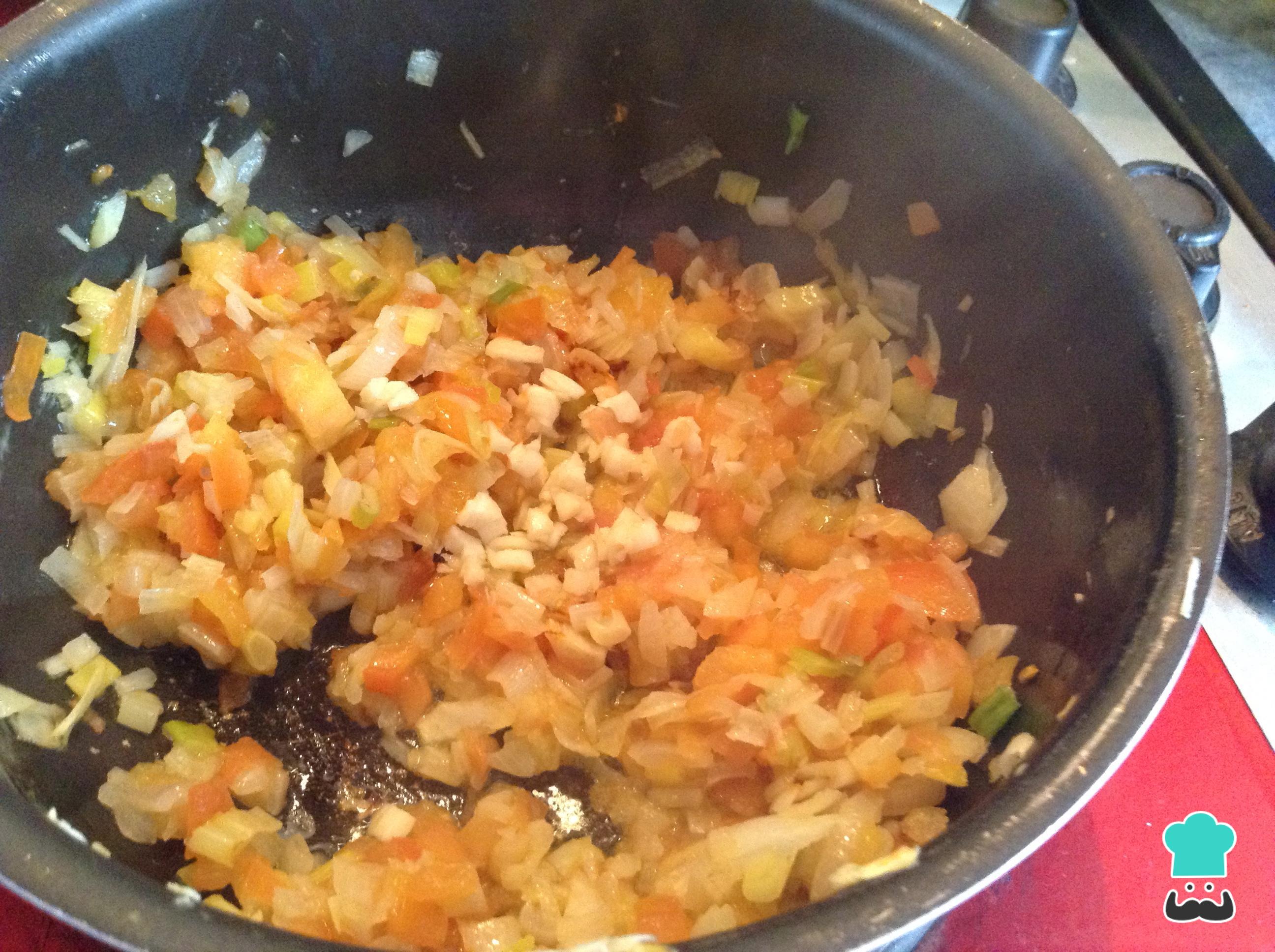 Adicione os dentes de alho finamente picados. Estamos preparando um refogado rico que irá conferir mais sabor a esta receitade grão-de-bico.