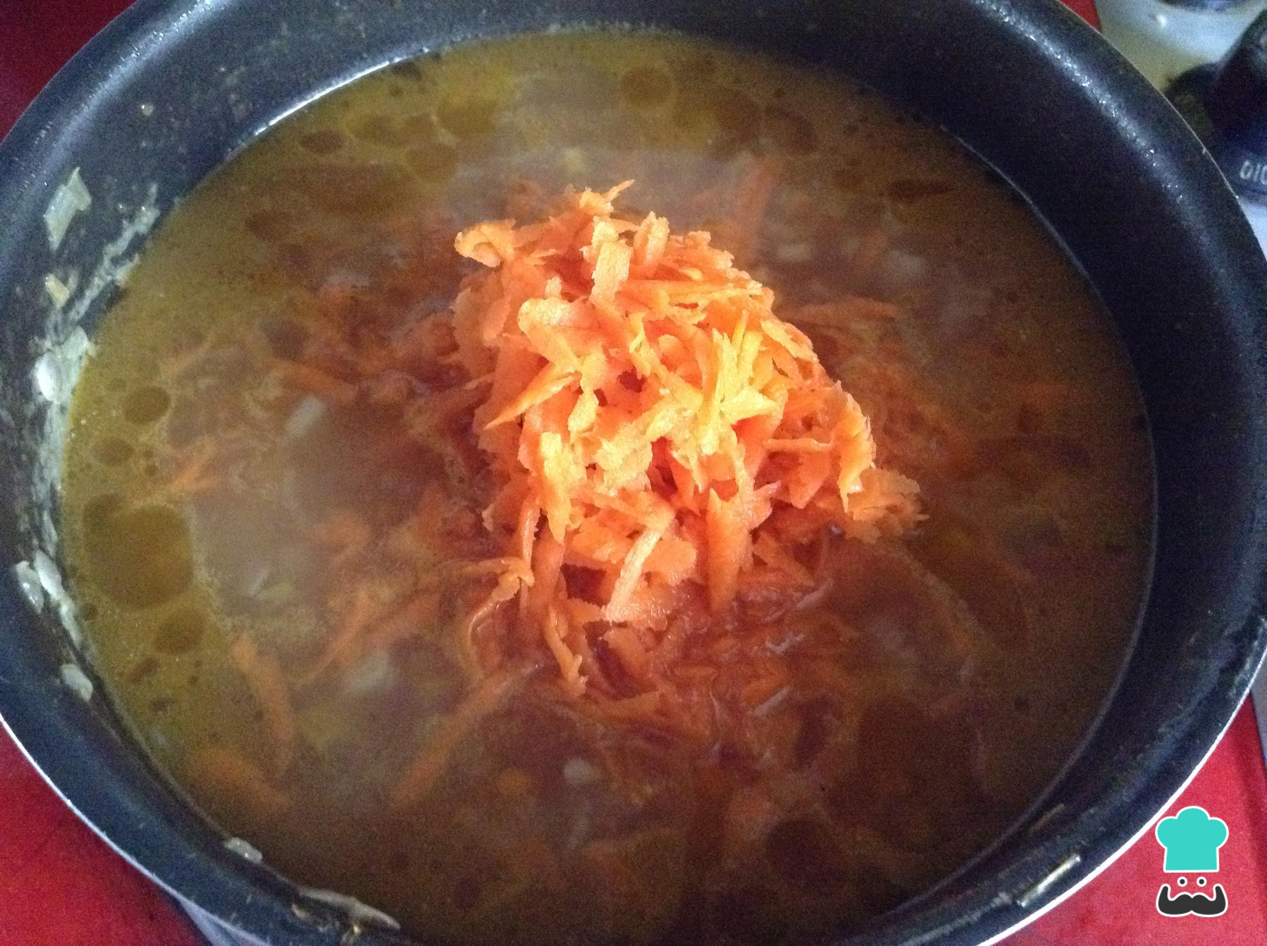 Após 20 minutos de cozimento, adicione a cenoura ralada e continue cozinhando tampado.