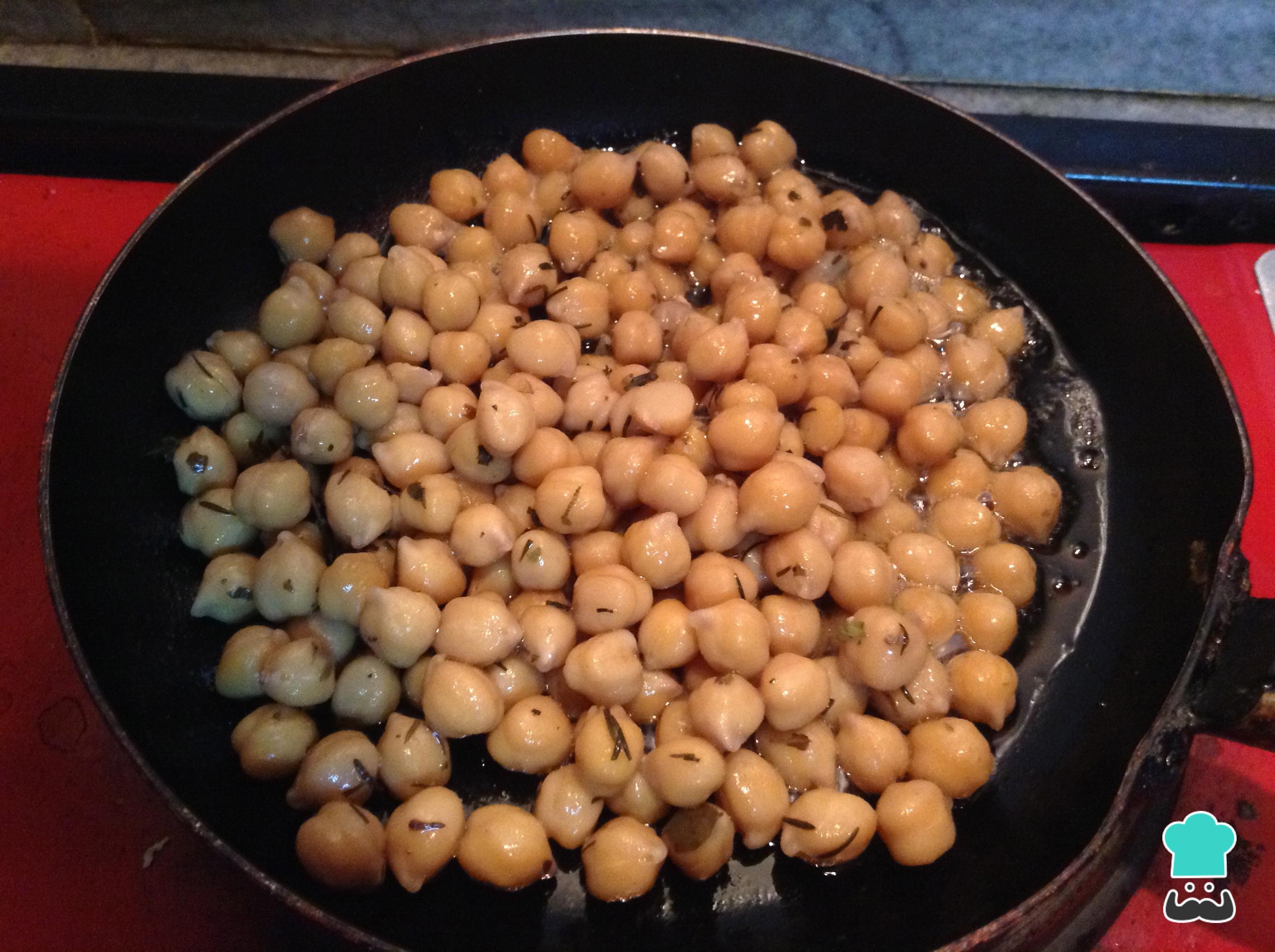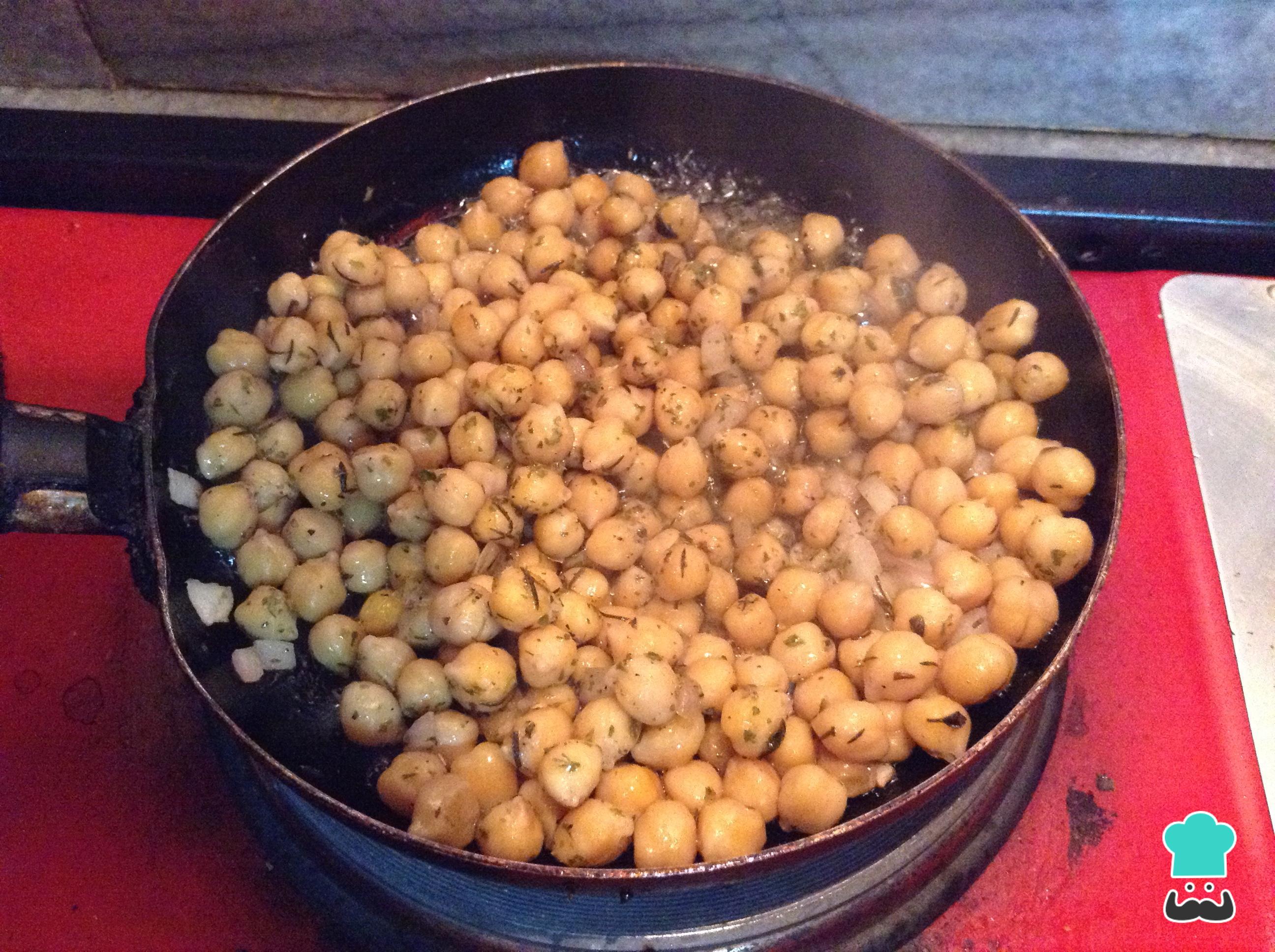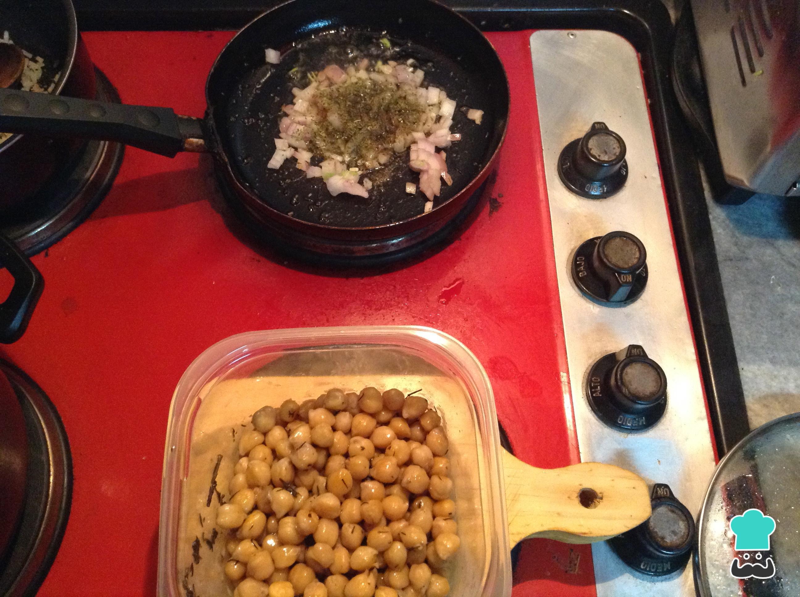 Em uma frigideira média adicione um pouco de óleo vegetal, acrescente o grão de bico e refogue por 10 minutos.