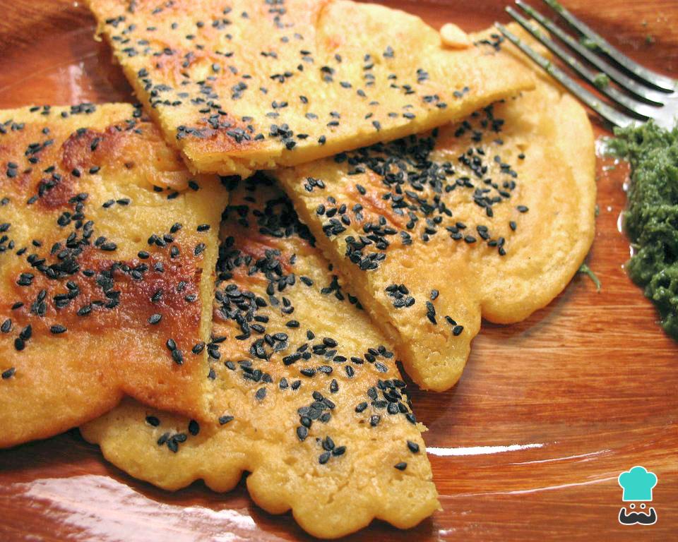 Após o tempo indicado leve ao fogo uma frigideira antiaderente ou levemente untada com um pouco de azeite. Quando estiver quente coloque uma porção da massa de grão de bico e, se quiser, polvilhe algumas sementes de gergelim. Deixe até desgrudar da frigideira, depois vire e deixe até desgrudar desse lado também.