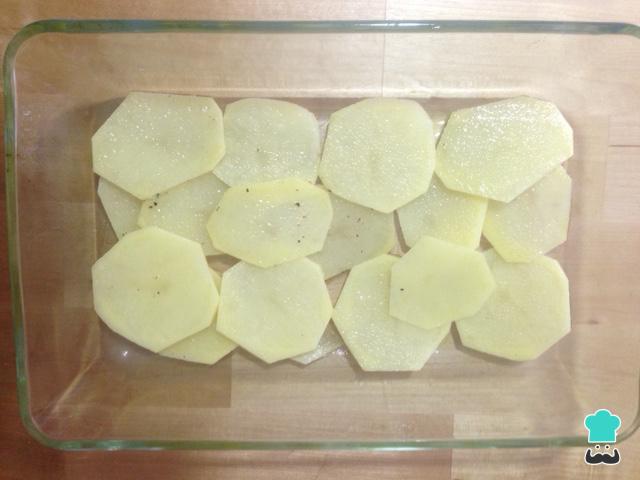 Descasque as batatas e corte-as em fatias finas. Coloque uma camada de batatas em uma assadeira untada com um pouco de azeite e tempere com de sal e pimenta.