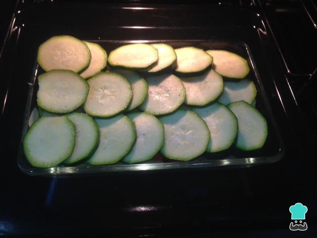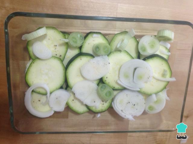 Em seguida, acrescente uma camada de abobrinha e de cebola em rodelas. Nós deixámos a pele da abobrinha mas, se você preferir, você pode descascar. Tempere também com sal e pimenta.