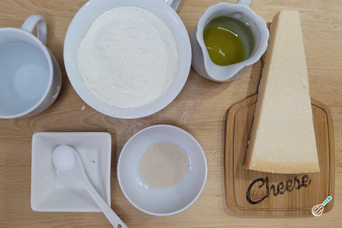 Separe os ingredientes para fazer seus grissini. Farinha de trigo, parmesão, sal, fermento biológico, água e azeite.