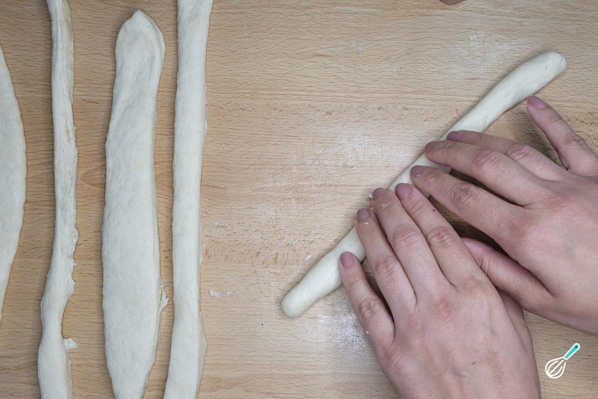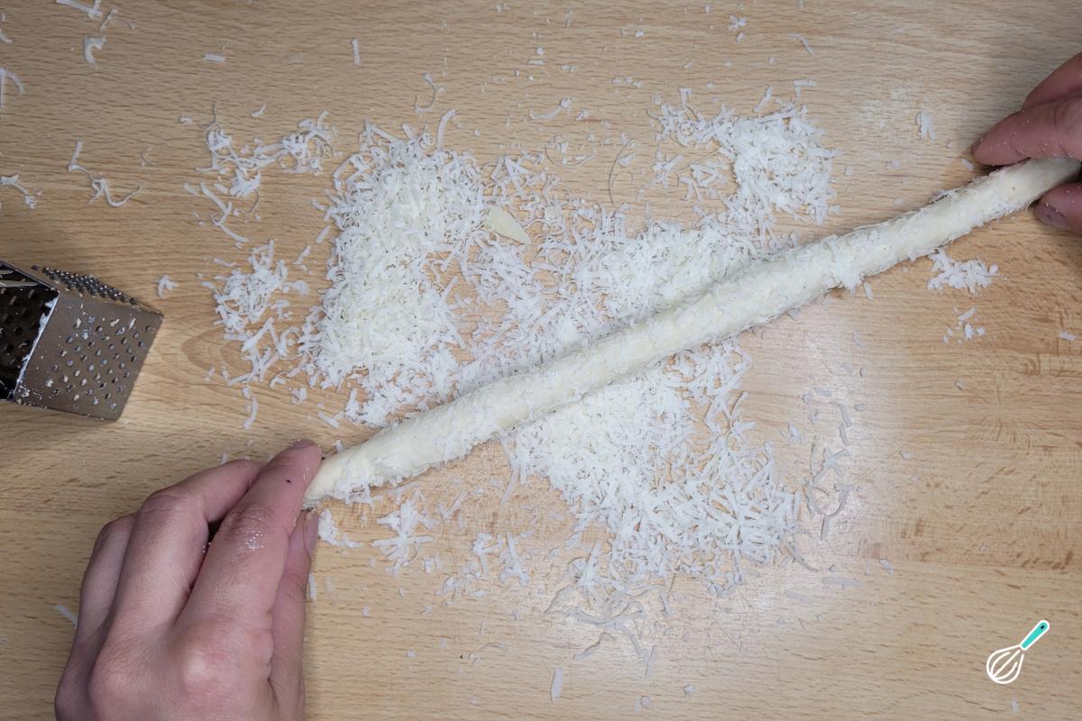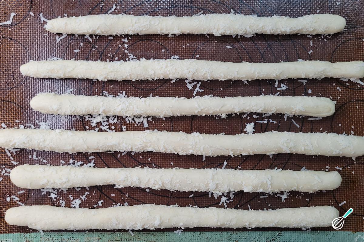 Pegue cada tira e alongue para formar os palitinhos. Neste processo, evite adicionar farinha na bancada, porque os pãezinhos precisam da umidade e isso também permite que o parmesão grude melhor nos pães. Se estiverem grudando muito e tiver com dificuldade de modelar, polvilhe um pouco de farinha, mas sem exagerar.