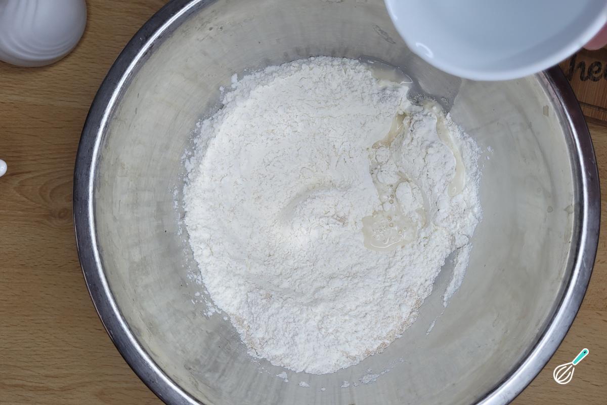 Comece a adicionar a água aos poucos, até perceber que toda a farinha foi incorporada. A capacidade de absorção de água depende de vários fatores, como a marca da farinha. Pode ser que você precise de mais ou menos água do que o indicado na receita, então é importante ir adicionando aos poucos para evitar que passe do ponto. Se sua massa estiver muito seca, adicione um pouquinho mais de água, sempre aos poucos. Dê preferência a usar água morna, que facilita na sova e acelera a ação do fermento, mas tome cuidado para não usar a água muito quente para não matar o fermento.