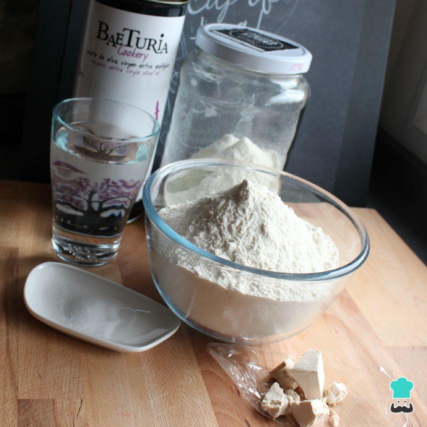 Comece por reunir os ingredientes necessários para preparar esta receita. Para conferir mais sabor a estes palitos de pão, você pode usar oréganos, sementes de gergelim, sal grosso ou em lascas, alho em pó, ervas de Provence, etc.