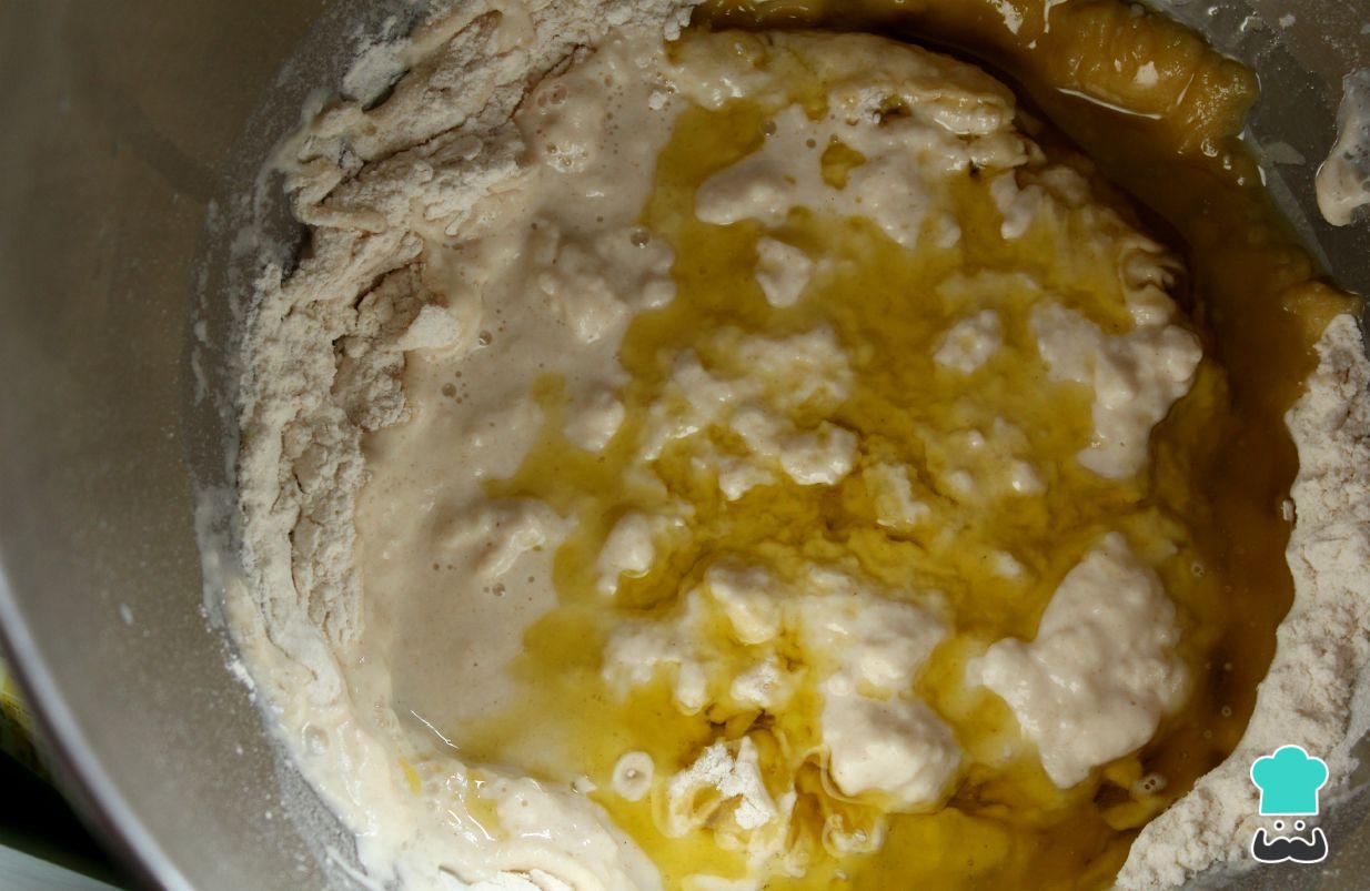 Enquanto isso, coloque a farinha e o azeite em outra tigela. Comece misturando estes dois ingredientes e, pouco a pouco, adicione água para obter uma massa homogênea e sem grumos.