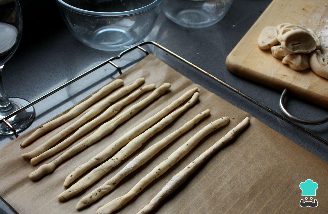 Enrole cada uma dessas fatias, de forma a obter palitos de massa. Coloque em um tabuleiro ou grelha de forno com papel manteiga, cubra com um pano úmido e deixe repousar mais 30 minutos. Enquanto isso, ligue o forno nos 200ºC.