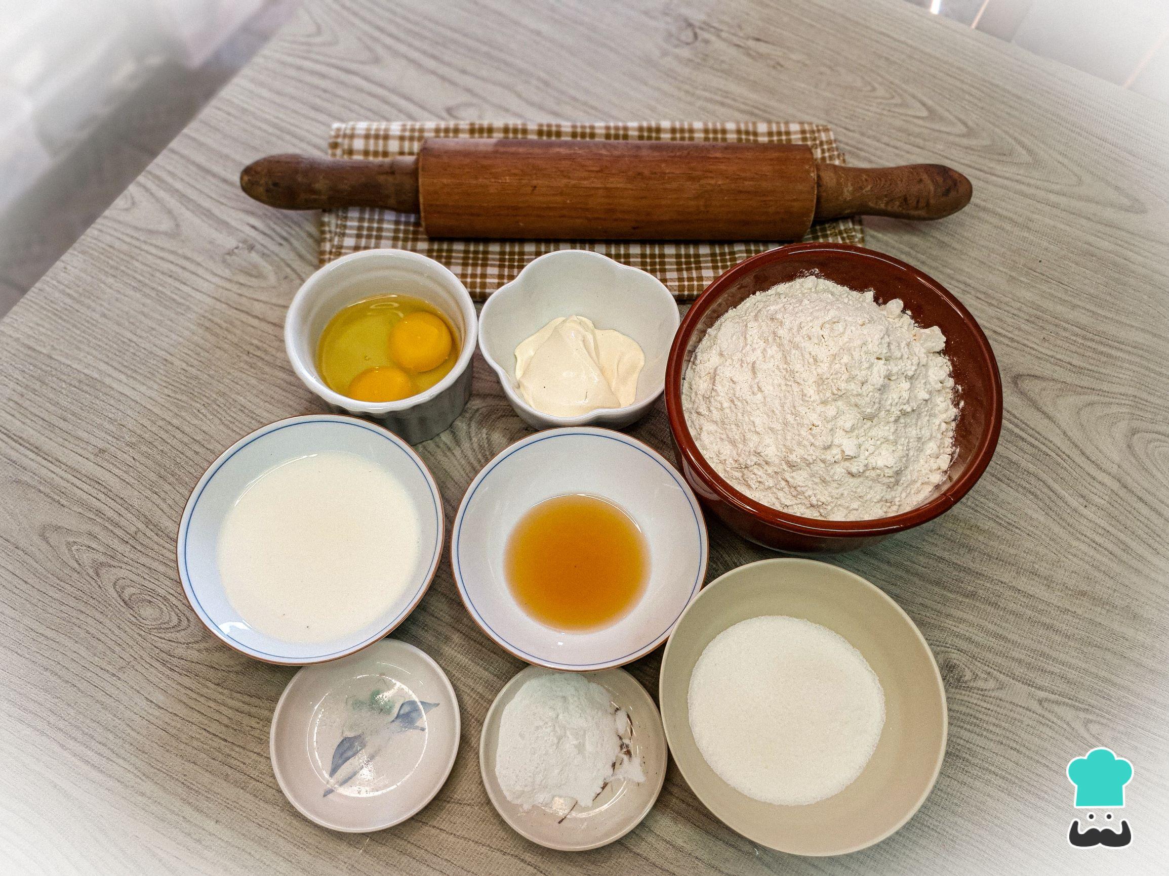 Separe todos os ingredientes necessários para a receita. Você também irá precisar de um rolo de massa, um bowl, um fouet e uma faca.