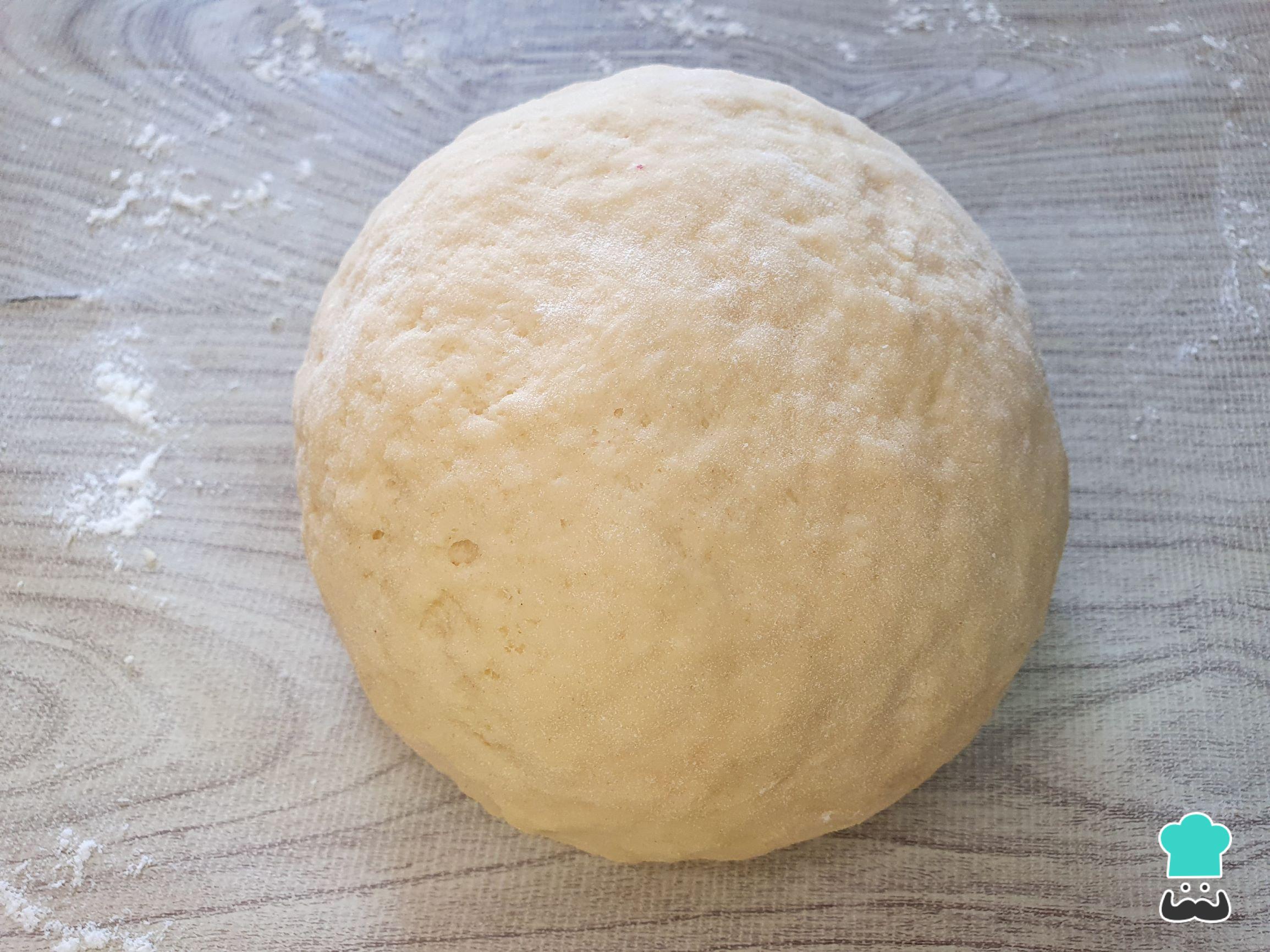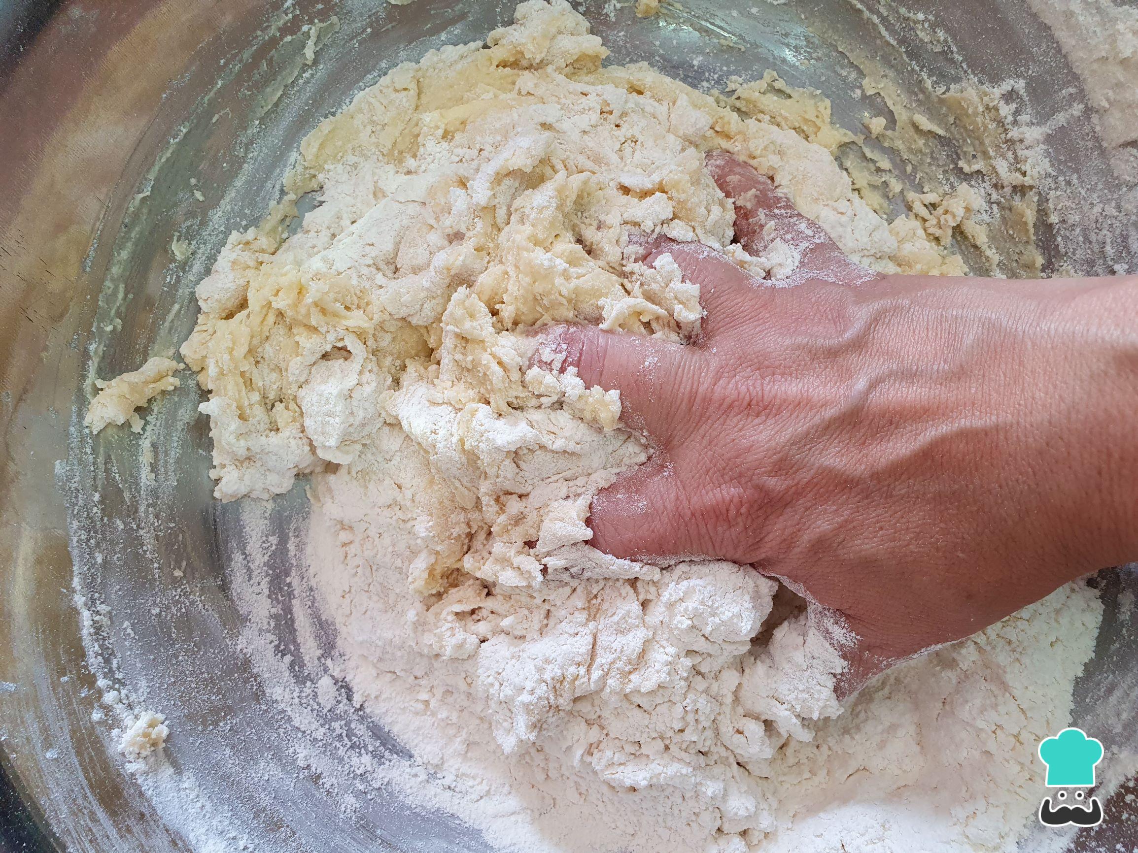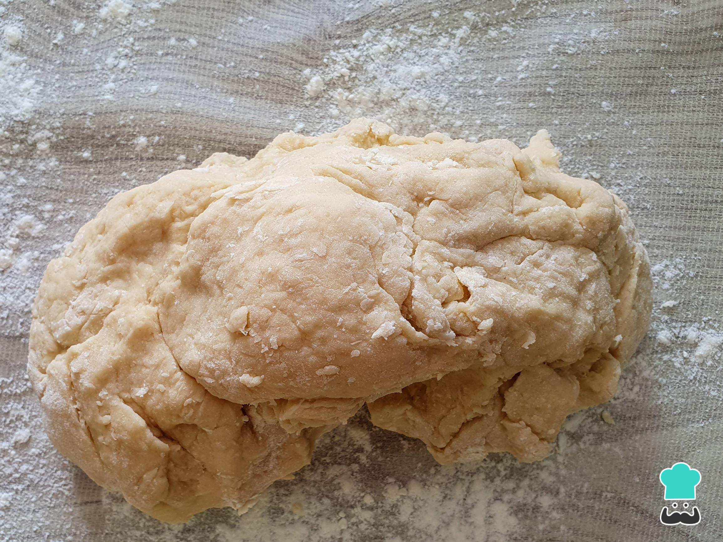 Traga a massa para uma bancada enfarinhada e misture muito bem até que forme uma massa lisa e que se desprenda das mãos.