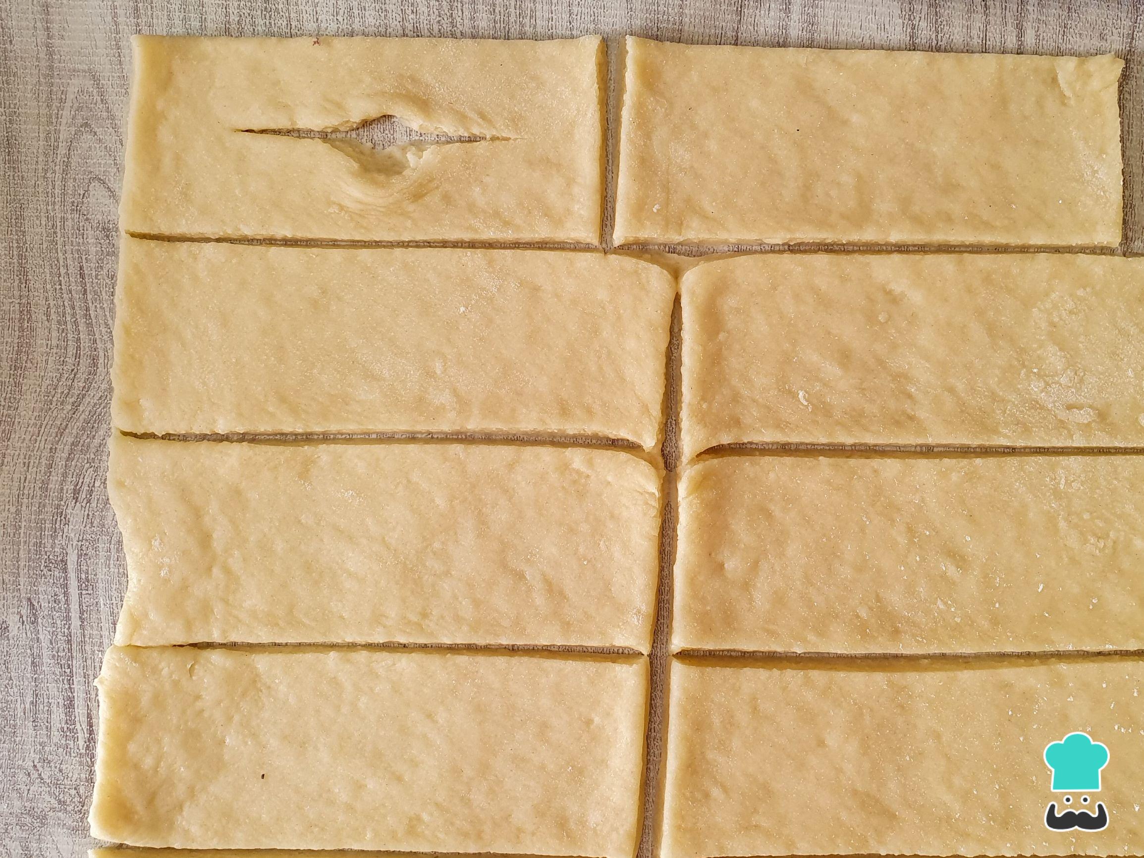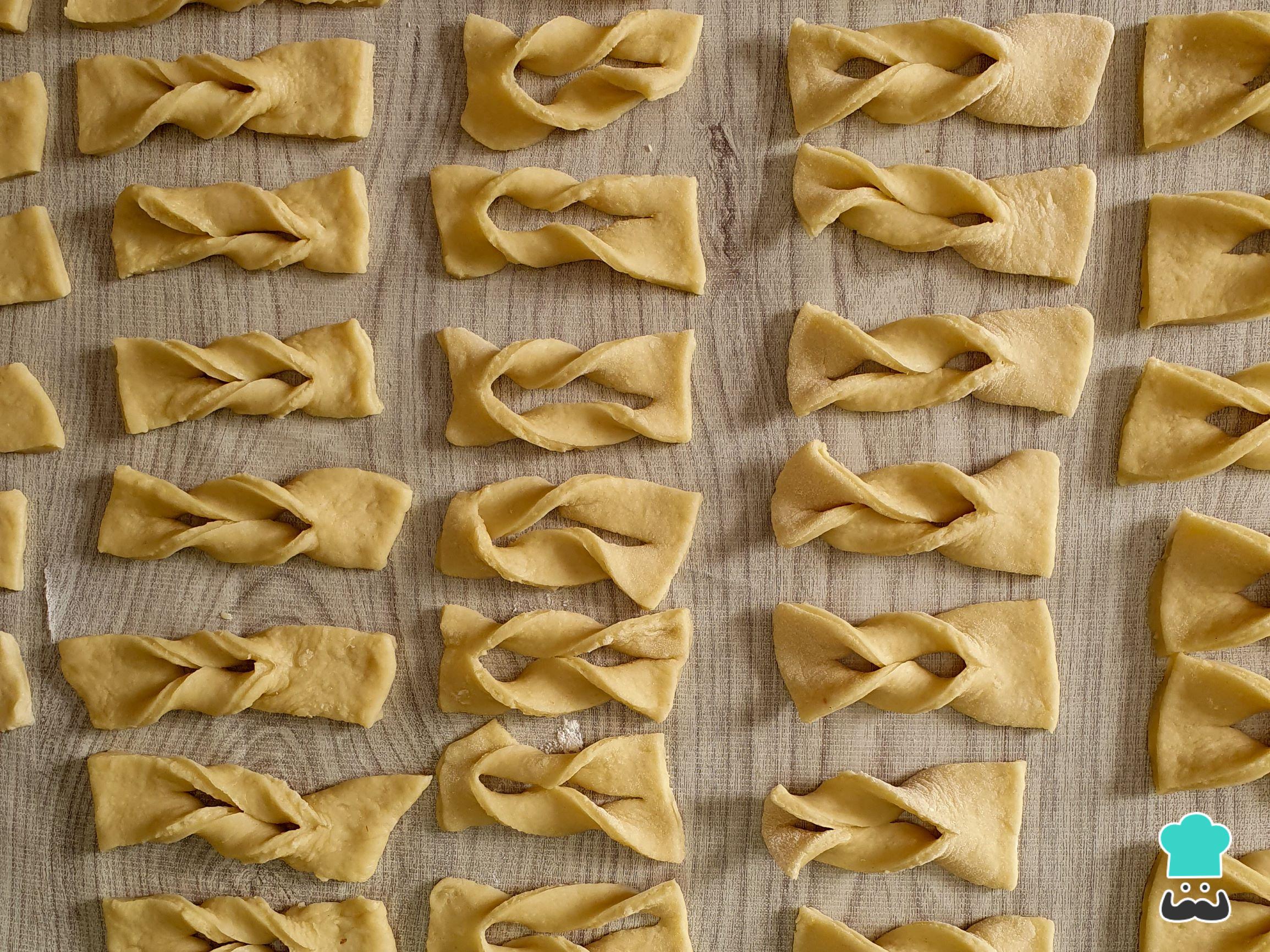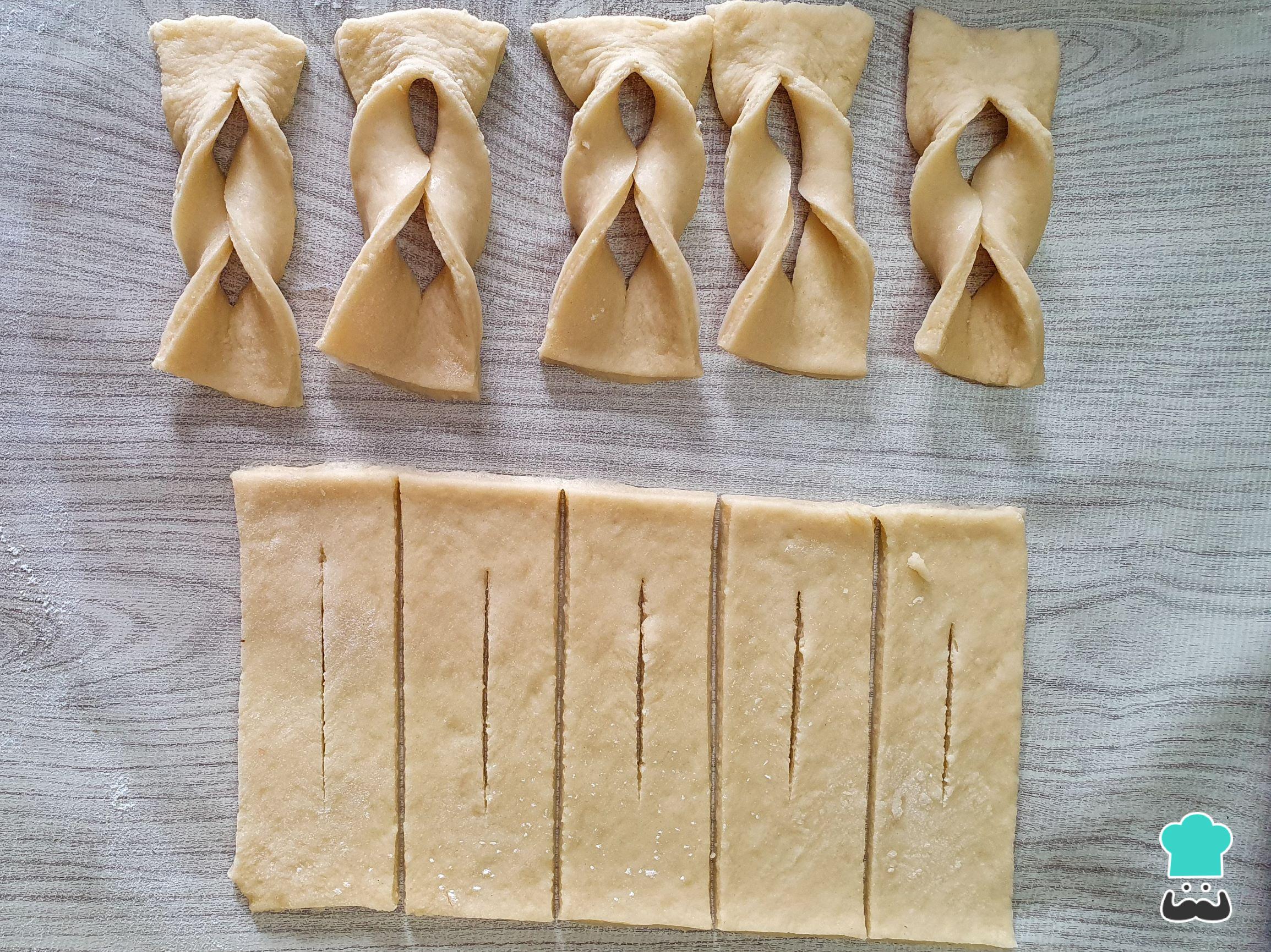 Abra a massa com a ajuda de um rolo de massas, até que fique em uma espessura de cerca de meio centímetro. Corte retângulos de aproximadamente 10 cm de comprimento por 3 cm de largura. Com a ponta de uma faca, faça um corte no centro do retângulo.