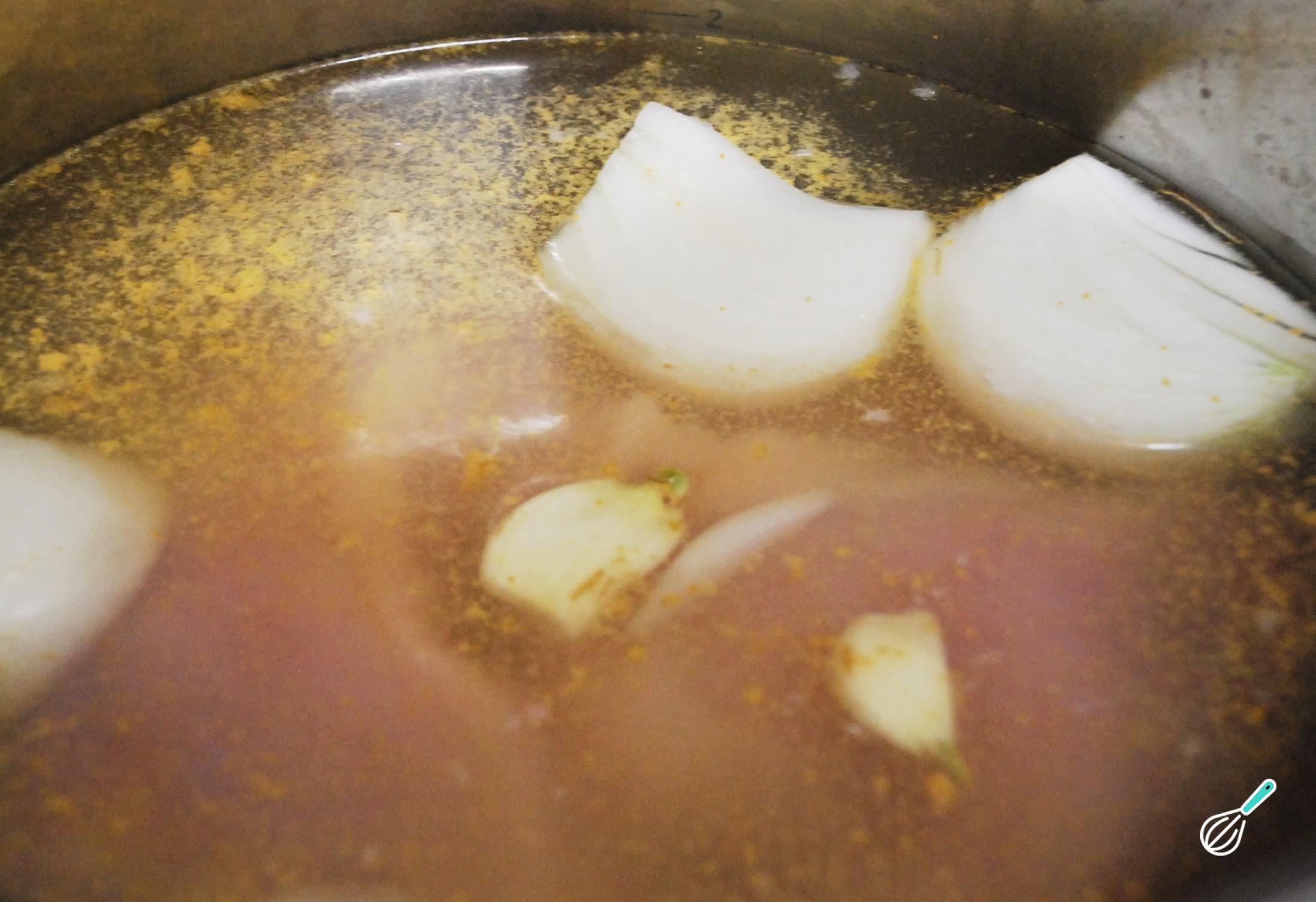 A primeira coisa a fazer para preparar esta receita venezuelana é cozinhar o frango. Coloque a carne em uma panela junto com o tablete de caldo, a cebola e os alhos cortados em metade, e cubra com água. Leve ao fogo médio e cozinhe por 15-20 minutos, ou até a carne deixar de estar crua.