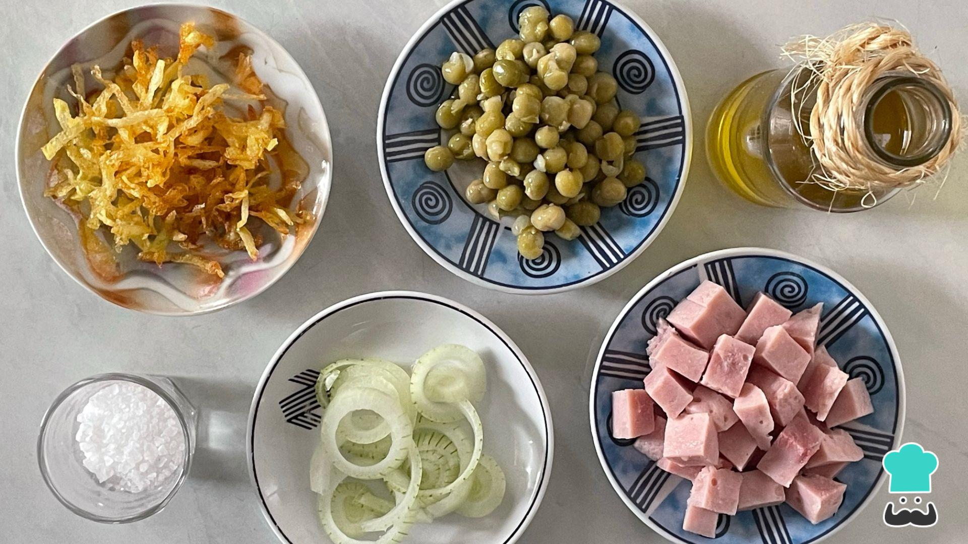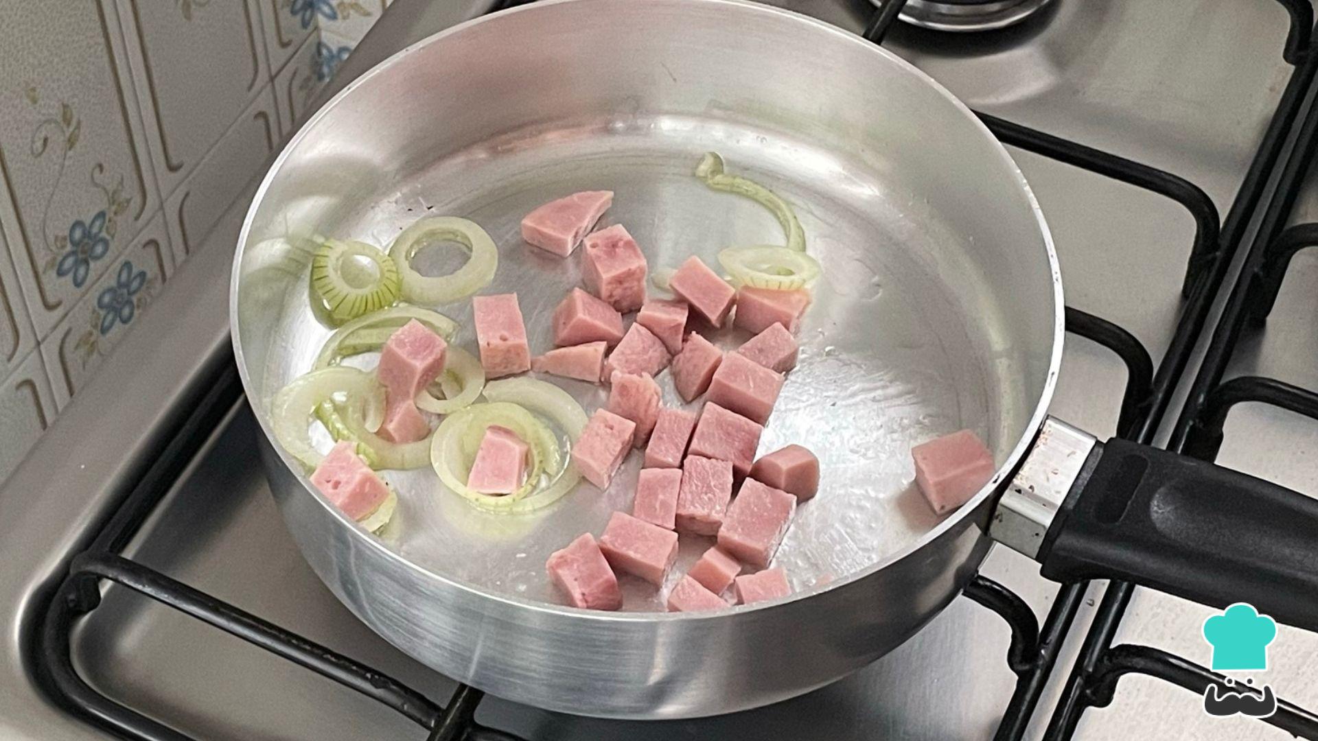 Separe os ingredientes da sua receita de guarnição à francesa. Corte o presunto em cubos e a cebola em rodelas finas.