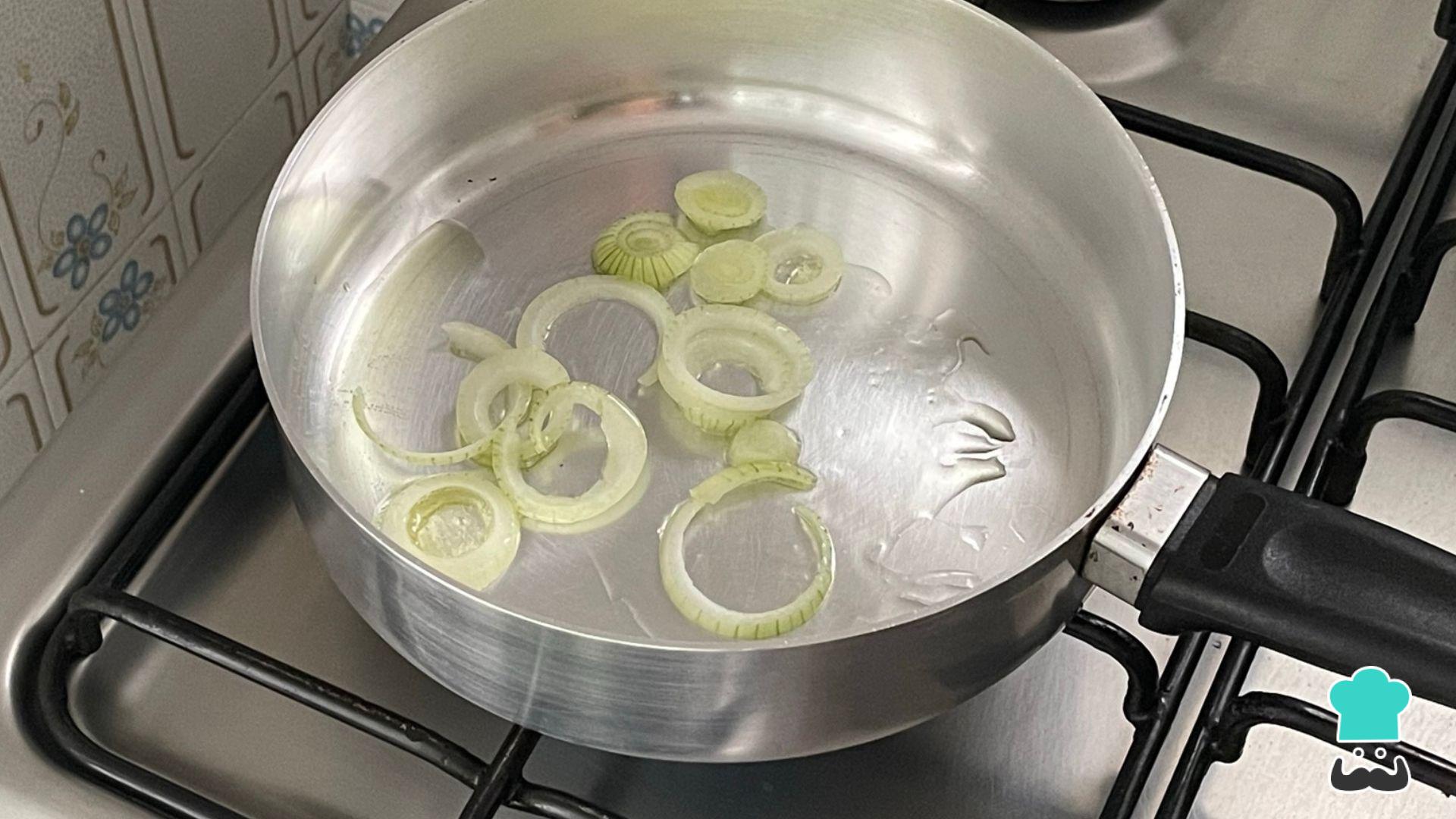 Leve uma frigideira ao fogo baixo, despeje um fio de azeite e refogue a cebola com uma pitada de sal.