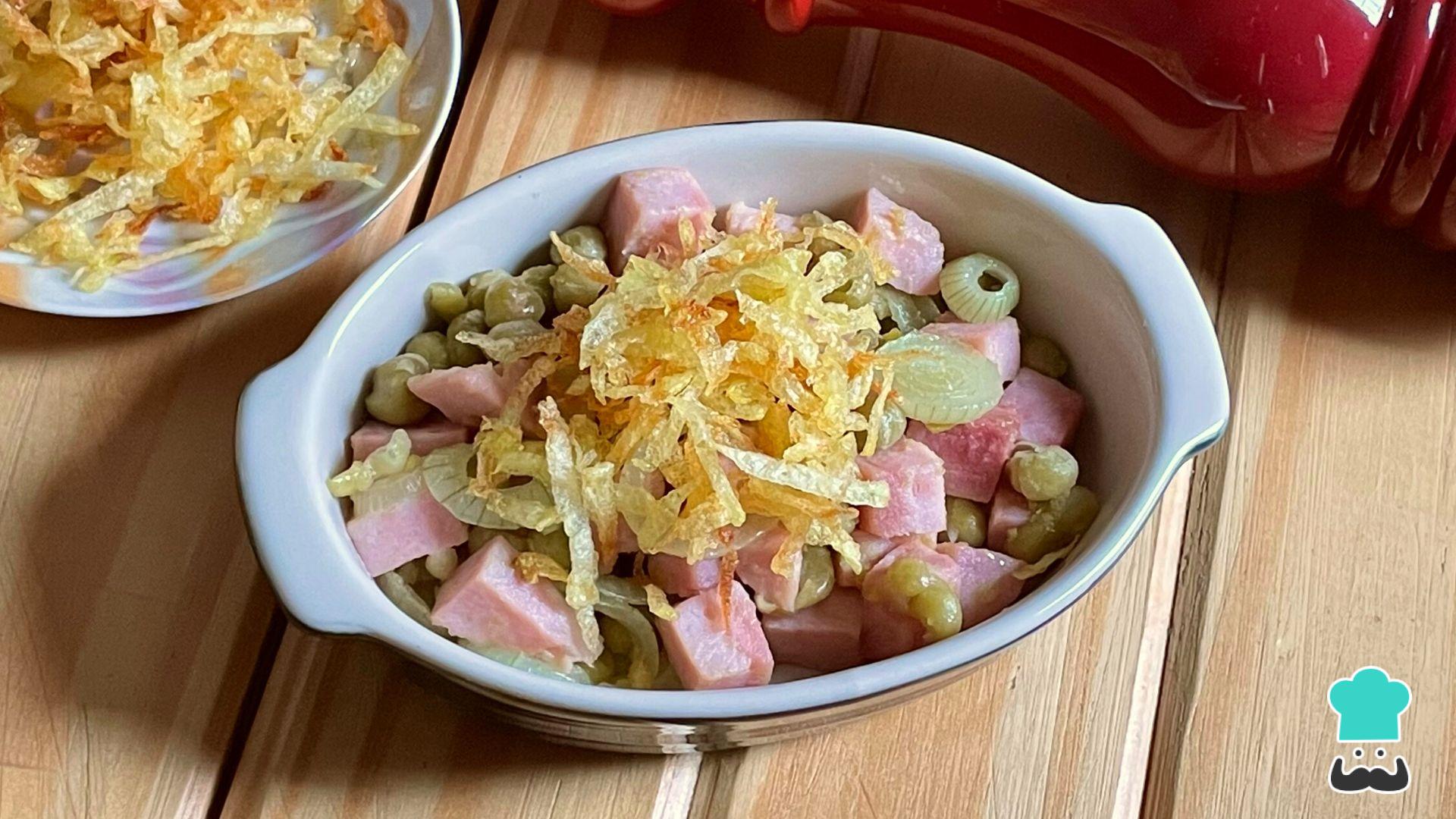 Trazendo o sabor do presunto + ervilha, essa guarnição tem ainda a crocância da batata palha, que pode ser comprada ou na versão caseira.