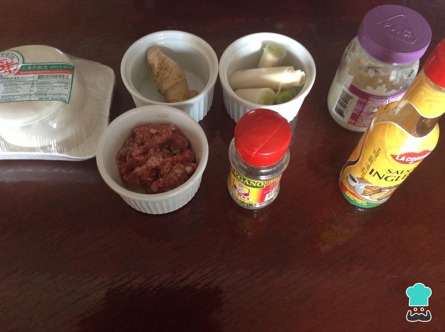 O primeiro passo para fazer nossa receita é preparar e organizar todos os ingredientes. A massa para guiozas pode ser comprada numa loja de proturos orientais.