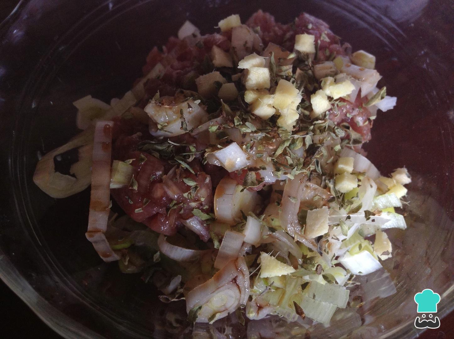 Ponha as carnes, o gengibre cortado finamente, o molho inglês, a pasta de alho, o alho-poró e o orégano num recipiente. Misture bem todos os ingredientes para fazer as nossas guiozas de carne.