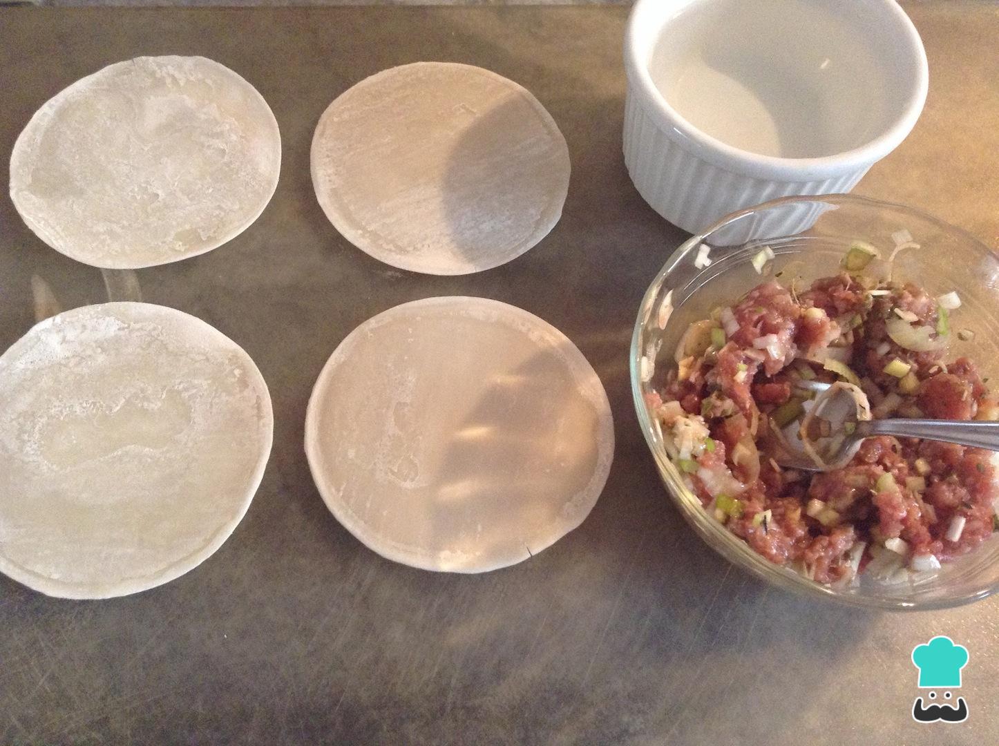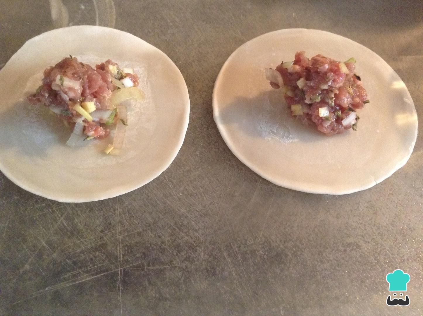 Com a ajuda de uma colher de sobremesa adicione um pouco do recheio das guiozas de carne. Em seguida, com a ponta dos dedos molhe as extremidade da massa como mostramos na fotografia.