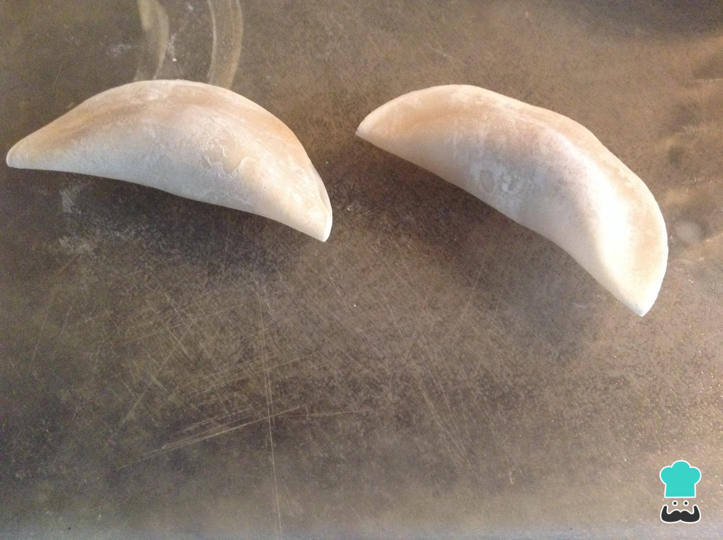 Feche as empadas japonesas como mostramos na imagem, não se esqueça que umedecemos um pouco as borcas da massa para que esta se feche melhor e o recheio não saia.