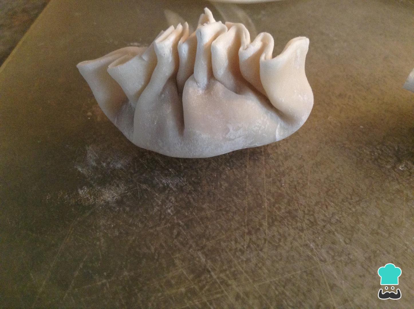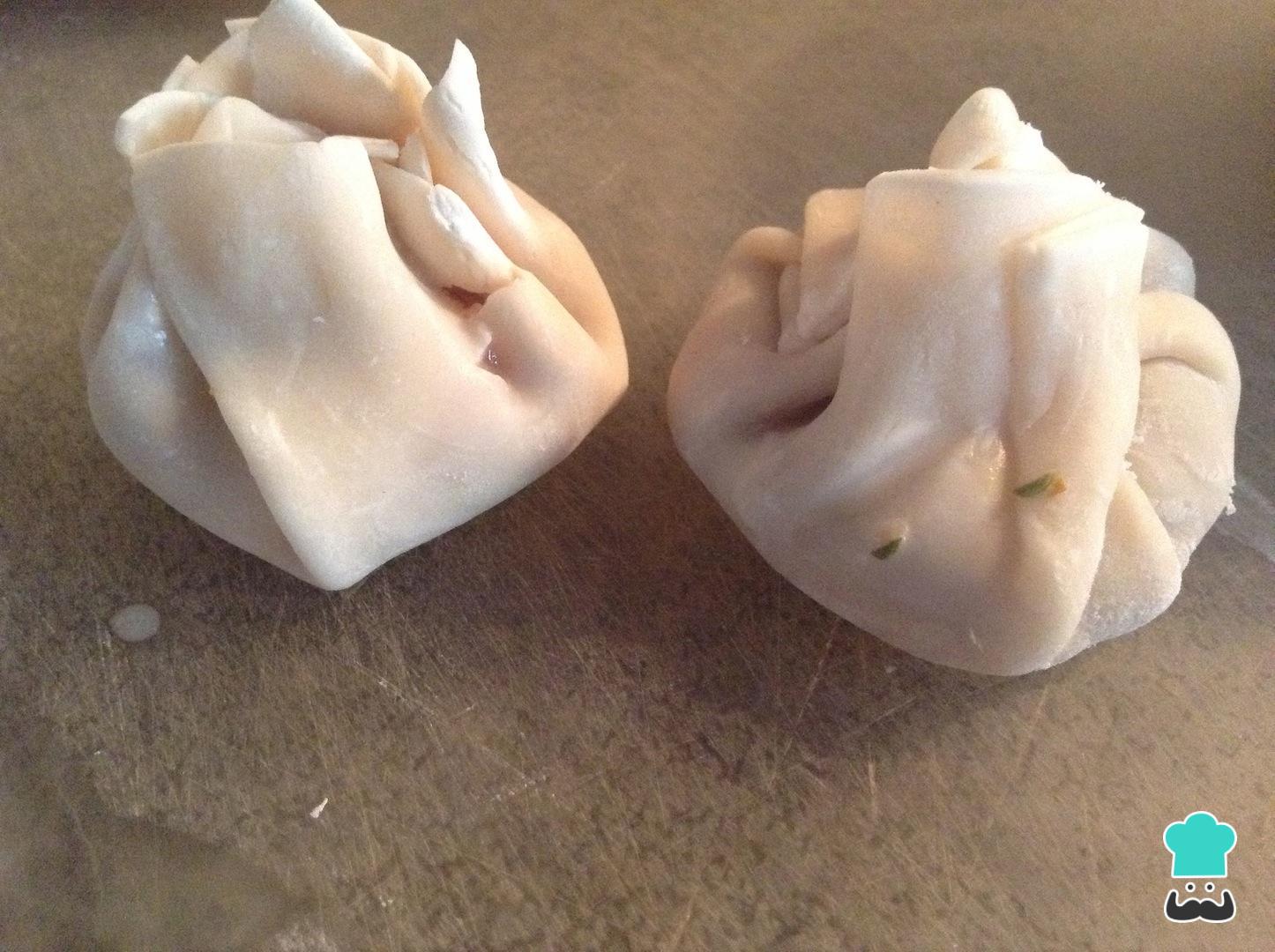 Para fazer esta outra forma de guioza de carne só tem que fechar a empada como se fosse uma bolsa e em seguida girar para fechar as pontas.