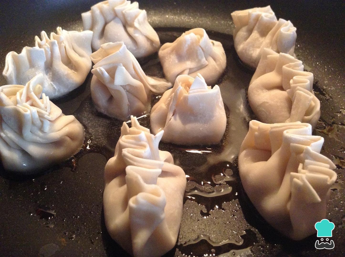 Assim que a frigideir estiver quente junte as guiozas e cozinhe até ver que ficam douradas. O centro deve ficar suculento e a massa deve ficar ligeiramente corcante.