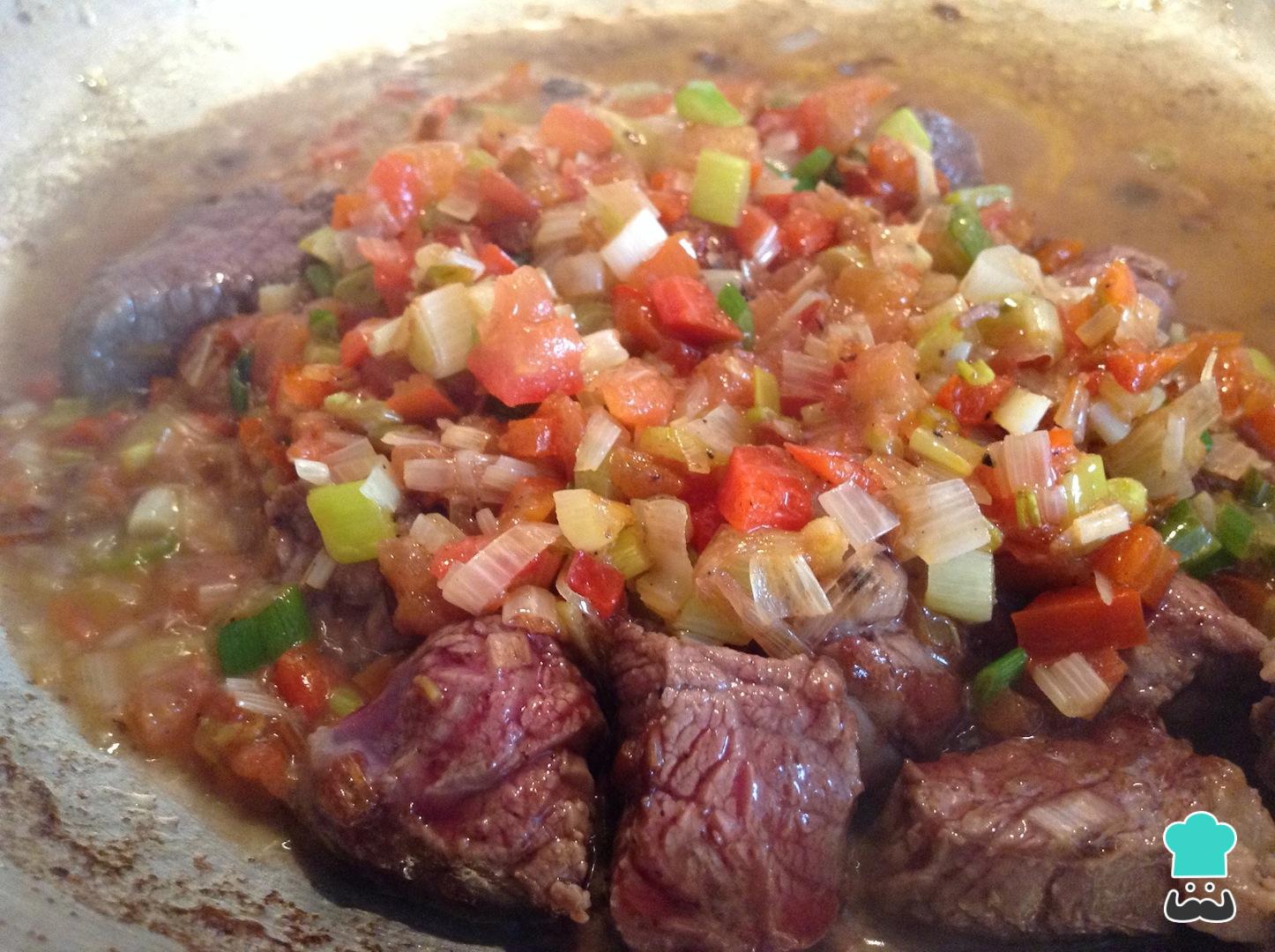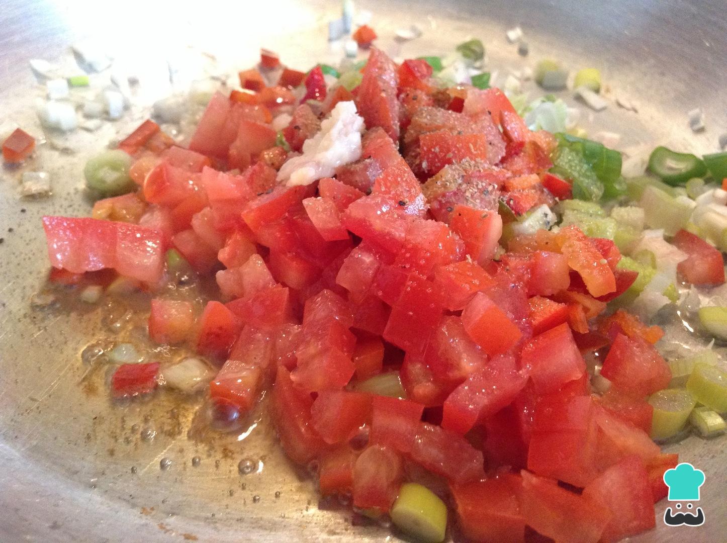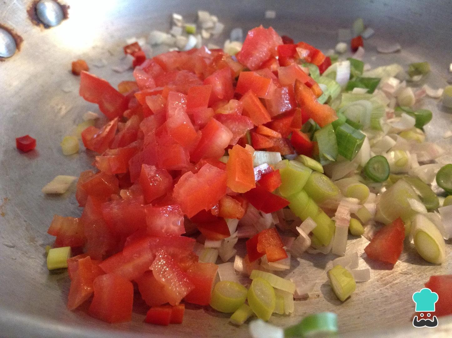 O passo seguinte desta receita de guisado é fazer a base de refogado! Para isso corte em pedaços pequenos a cebolinha verde ou cebola, o pimentão e os tomates sem sementes, e leve ao fogo médio-baixo numa panela com um pouco de óleo.